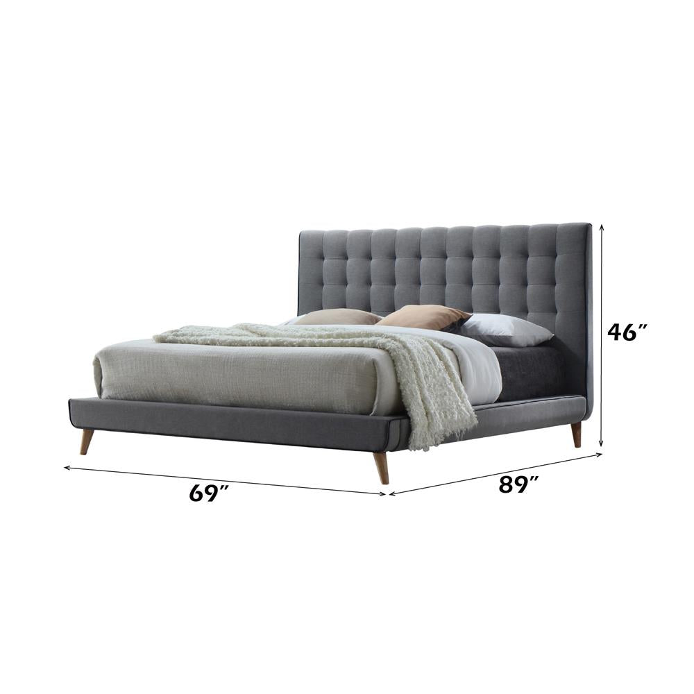 • Fully Padded Bed, Buttonless Tufted Headboard: Light Gray Fabric w/Black Piping