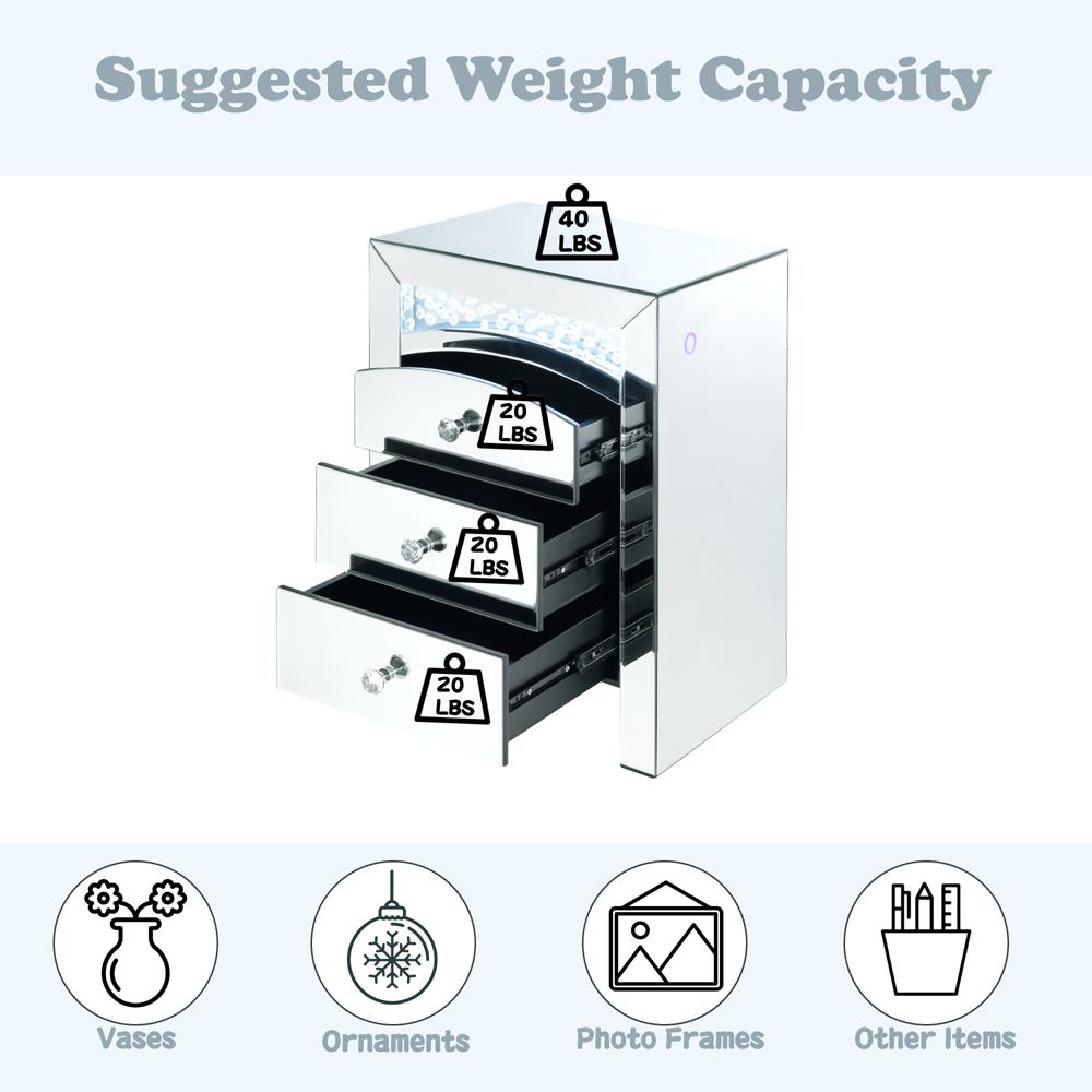• Features: Mirrored Finish, LED w/Faux Diamonds & Clear Glass, Mirrored Sled Base