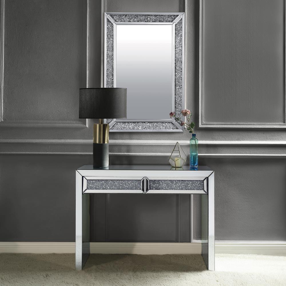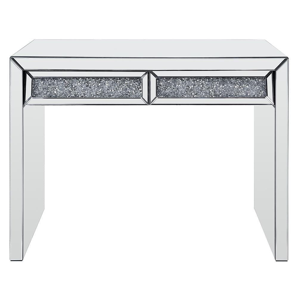 • Features: Mirrored Top, Mirrored Sled Base, Front Drawers w/Faux Diamonds Inlay & Clear Glass (Open Base)