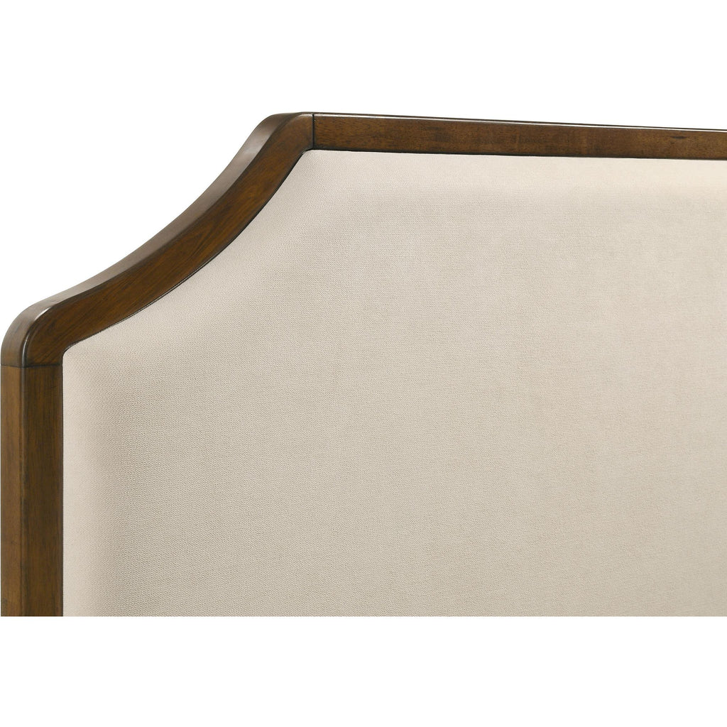 This panel bed reimagines classic Louis Philippe elegance with softened curves and graceful symmetry. Wrapped in cream fabric, the upholstered... This panel bed reimagines classic Louis Philippe elegance with softened curves and graceful symmetry. Wrapped in cream fabric, the upholstered headboard is framed with cutaway corners and sculpted rails, creating a romantic focal point. A warm brown cherry finish enriches the frame with traditional depth and charm. Expertly crafted from solid rubberwood, cherry veneer, and padded fabric, it offers lasting beauty and serene comfort. View more