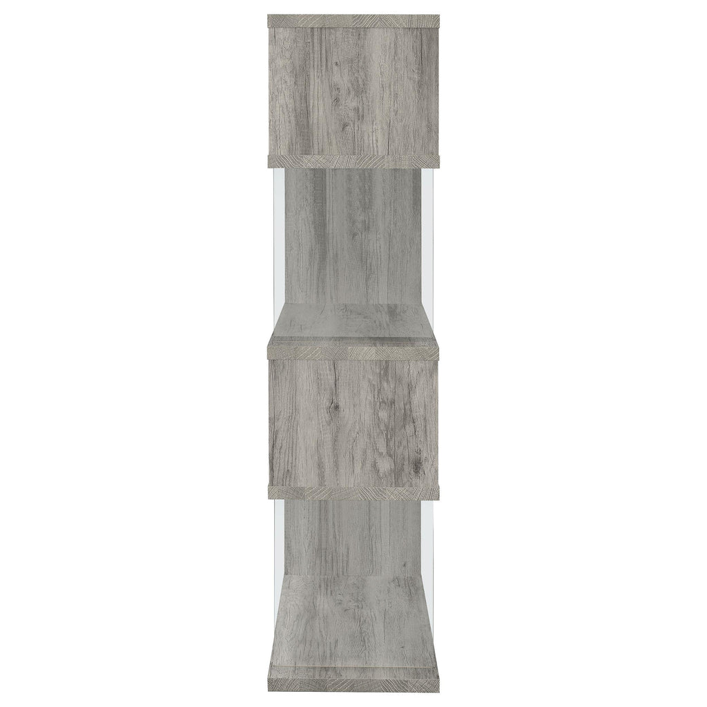 The asymmetrical zig-zag design of this contemporary bookcase creates a focal point in any room. Five open shelves in a... The asymmetrical zig-zag design of this contemporary bookcase creates a focal point in any room. Five open shelves in a light grey driftwood finish stack elegantly, supported by clear glass side panels that lend a modern flair to this furniture piece. Perfect for home offices, living rooms and much more, showcase anything from a book collection, decor, and other favorite items for all to see. With a flush base, this open bookcase unit rests sturdily and securely on the floor. Clean lines and a wonderful jagged design offer up style, functionality, and a stunning display. View more