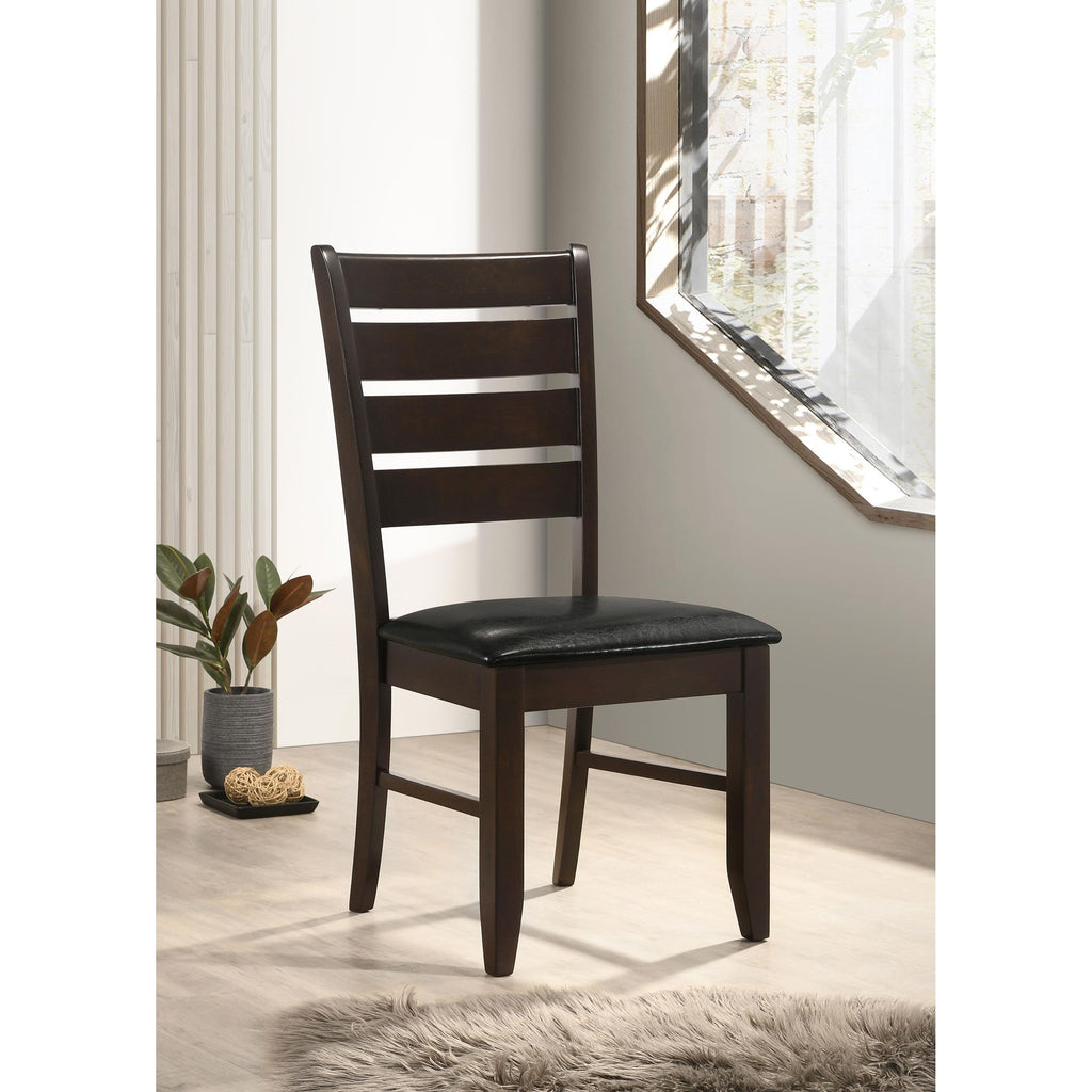 • Ladder back chairs have upholstered seat cushions in black leatherette