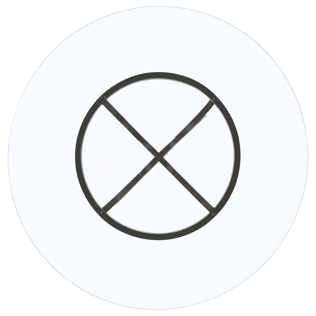 • A meticulously crafted metal table base with elegant curvaceous legs converging around an interlocking ring waist, crowned with a 6mm 48" diameter clear tempered glass