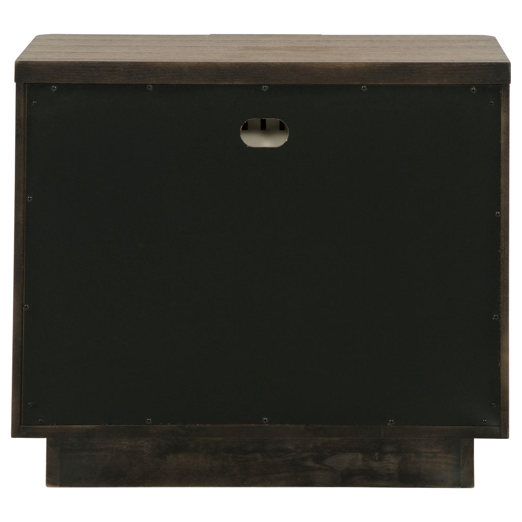 • Two roomy drawers in a modern wooden nightstand create ample bedside storage for essentials