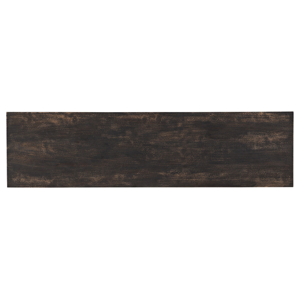 • Finish: Black finish with rub-through. Honeycomb pattern metal overlay is antique bronze with antique bronze starburst. Large rectangular hardware in metal and agate. Distressing includes sandblasting and wire brushing.