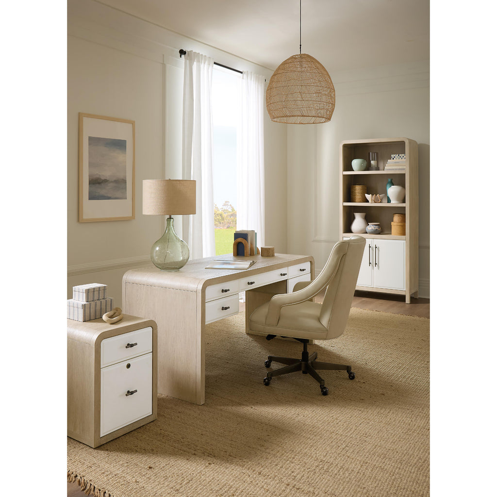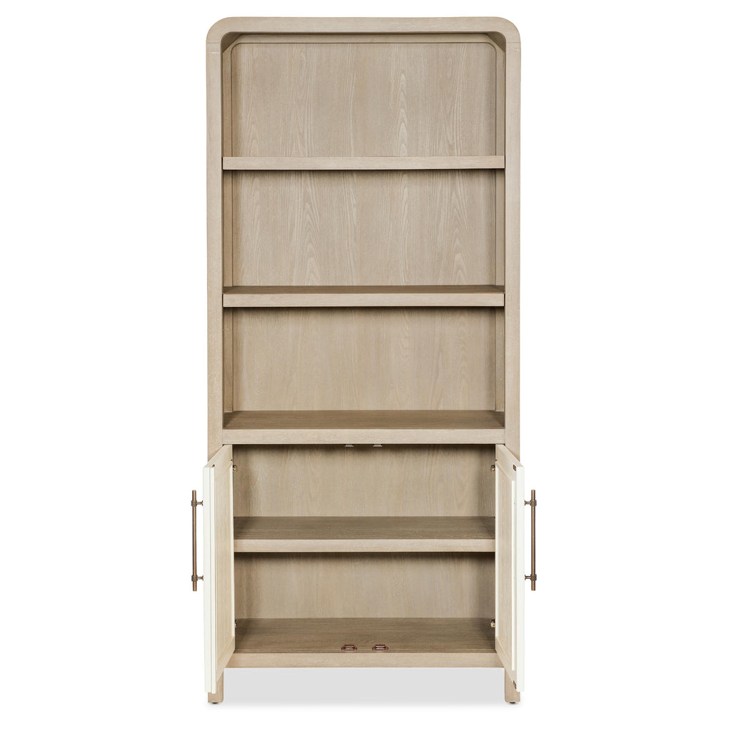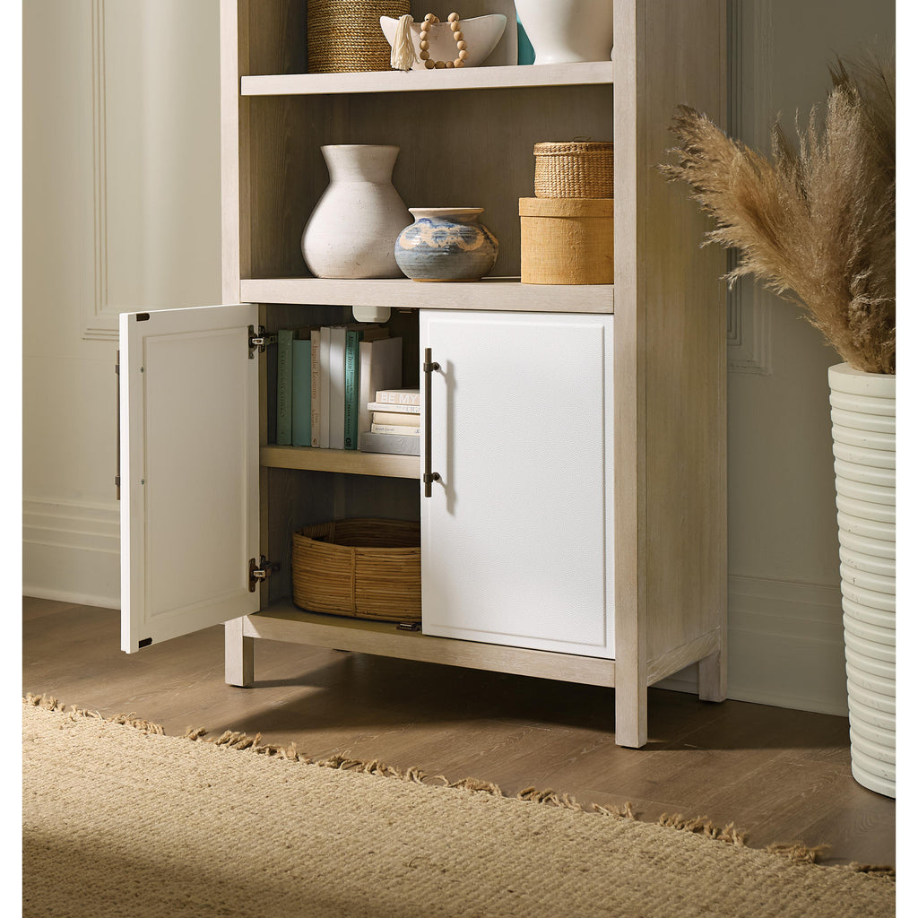 • Finish: Two-tone finish pairs soft, elm veneers in a pebble hue with door fronts in a contrasting ivory with leathered texture.