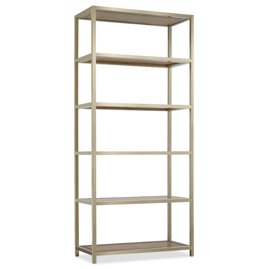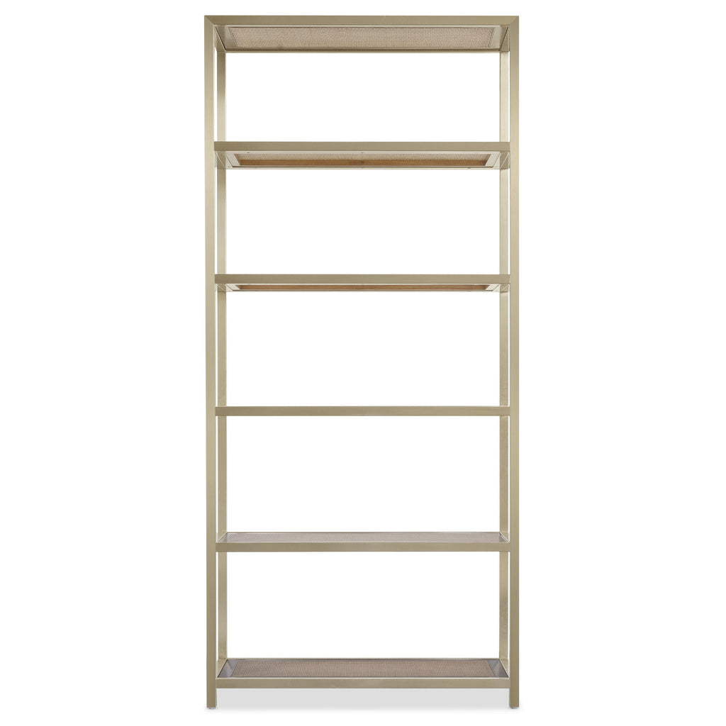 • Five fixed wood-framed cane shelves with glass inserts