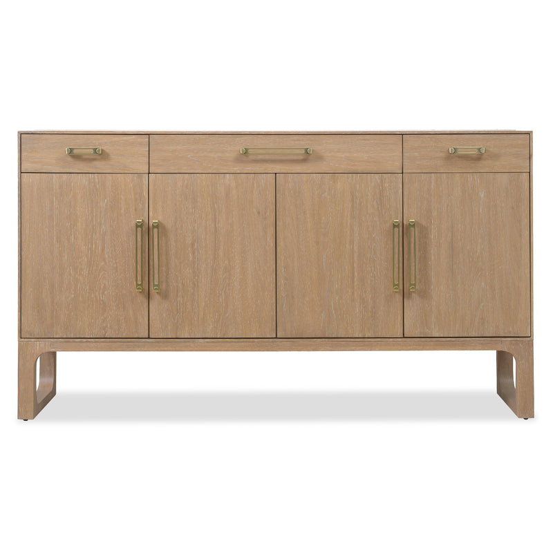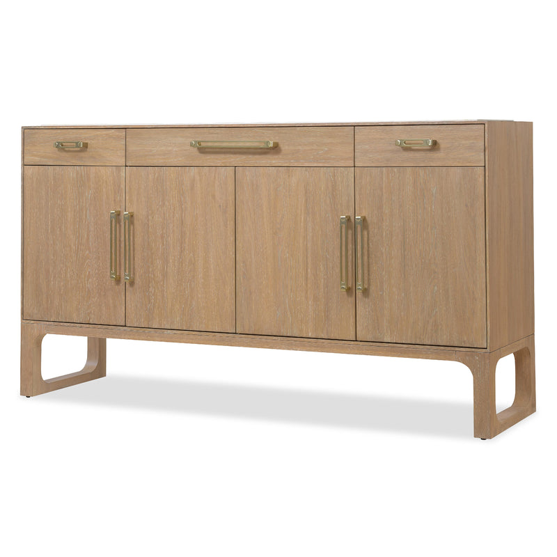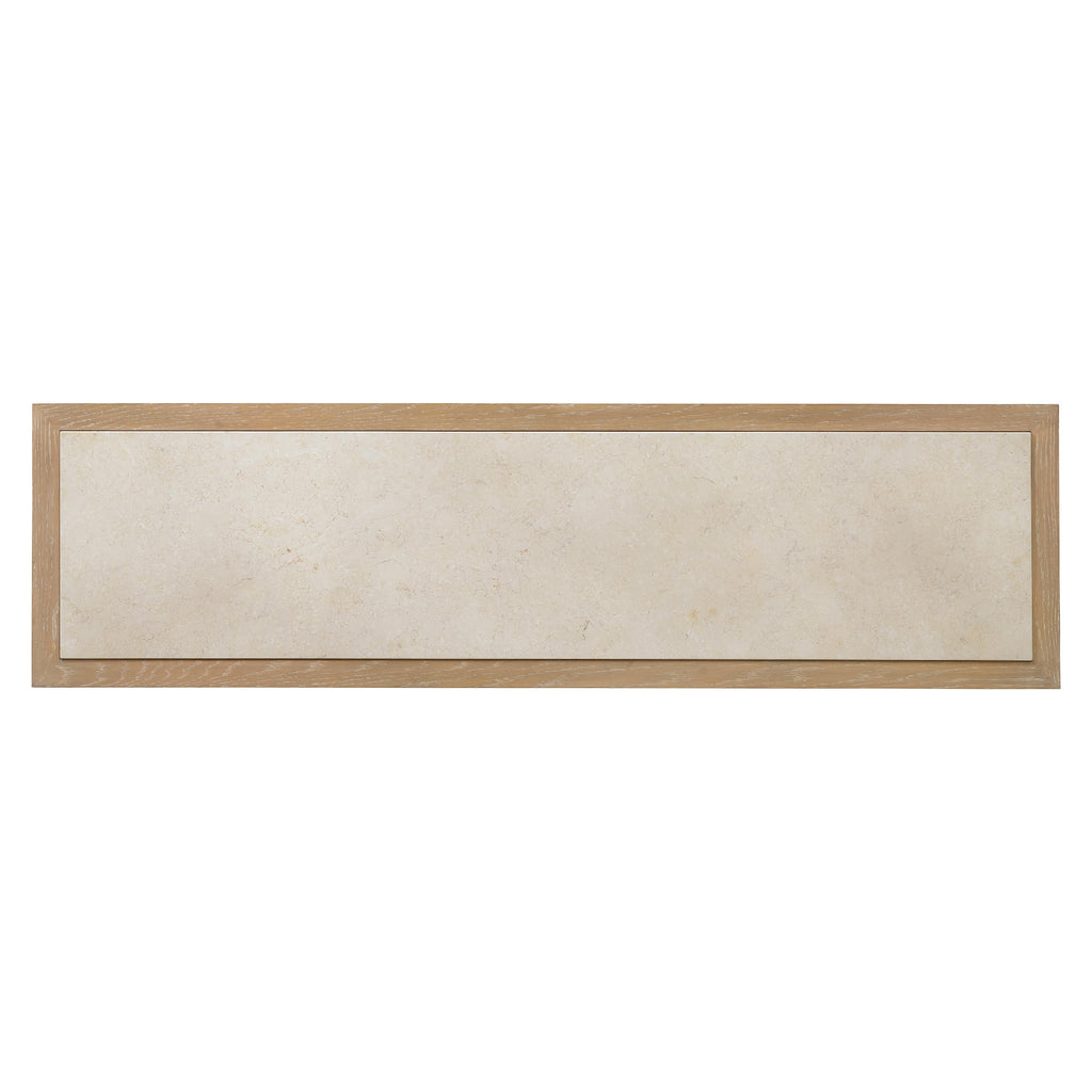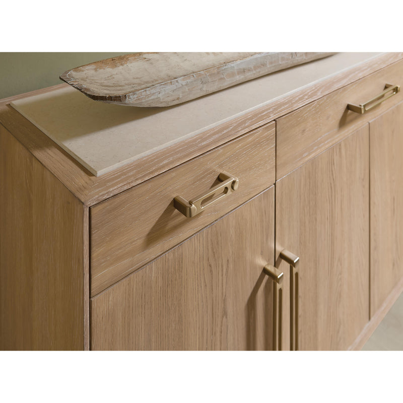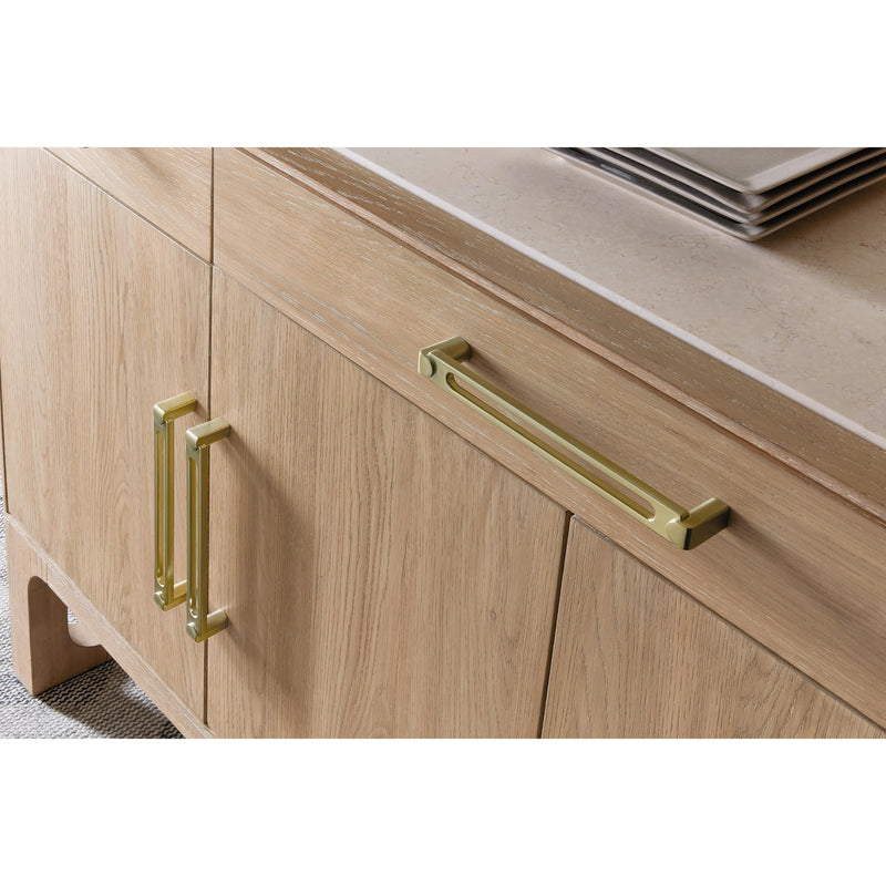 • Finish: The multi-step Desert Oak finish features wire-brushing and cerusing. The stainless steel custom bar hardware features a soft Brushed Brass finish. The Honed Egyptian marble top showcases a parchment tone with a natural blend of neutral and organic hues for a unique, elegant finish.