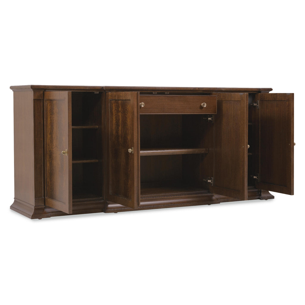 • Finish: The high clarity Classic Walnut finish over figured walnut veneers and walnut swirl veneers adds richness and depth. Custom pull hardware in Satin Brass finish.