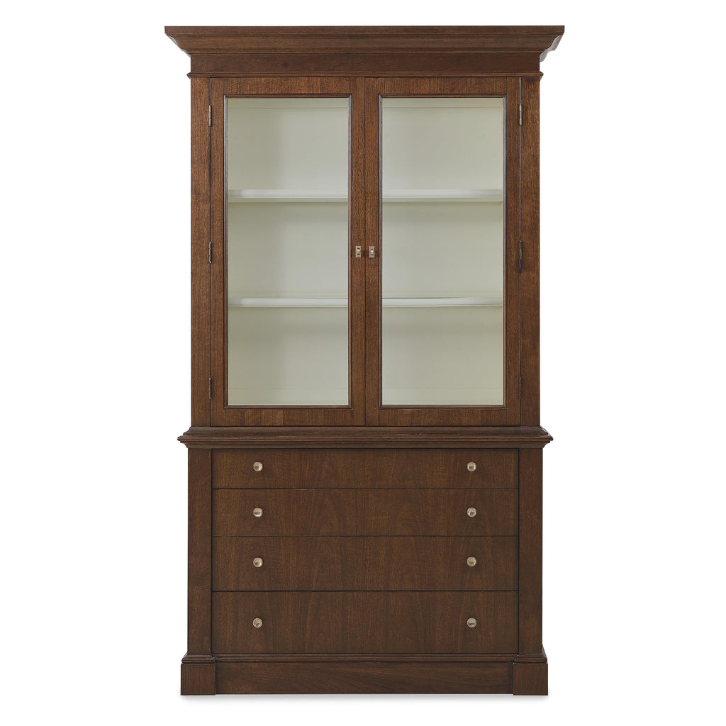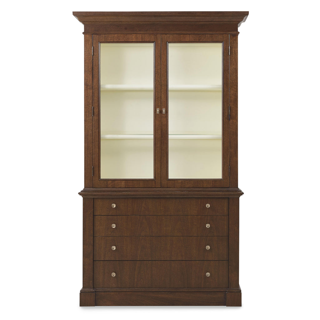 • Finish: The high clarity Classic Walnut finish over cathedral figured walnut veneers adds richness and depth. Contrasting cream colored interior back panel. Custom knob and pull hardware in Satin Brass finish.