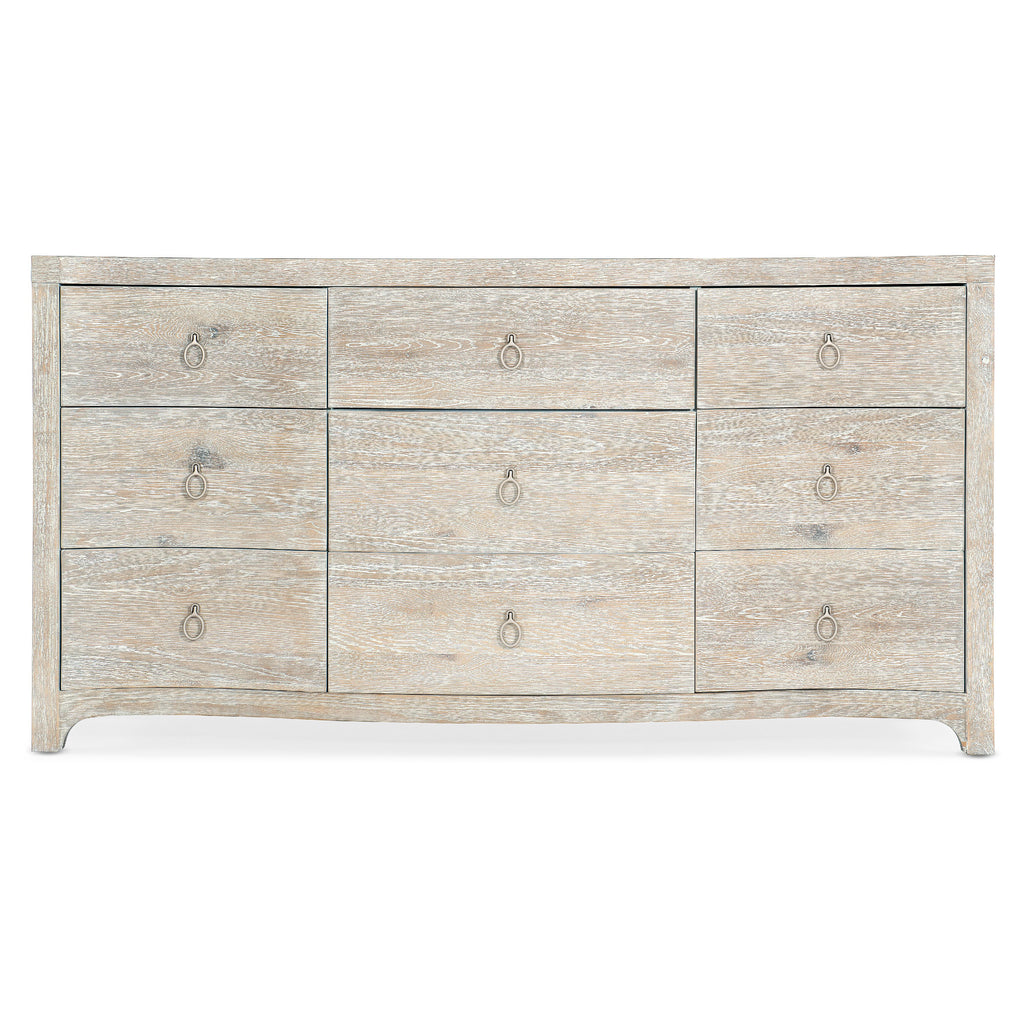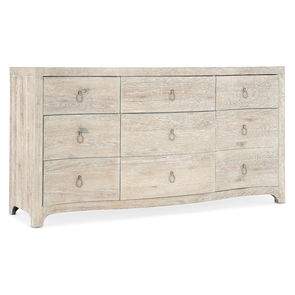 • Finish: Surf: light, airy whitewashed oak. Distressing includes sandblasting and wire brushing. Light champagne ring pulls.