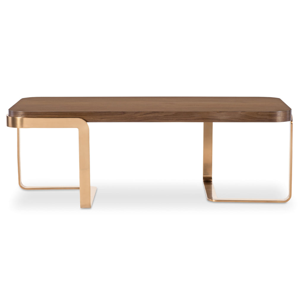 • Finish: Light Caramel finish featured on split-heart and quartered walnut veneers. Metal base is featured in plated Sunlit Bronze metal finish.