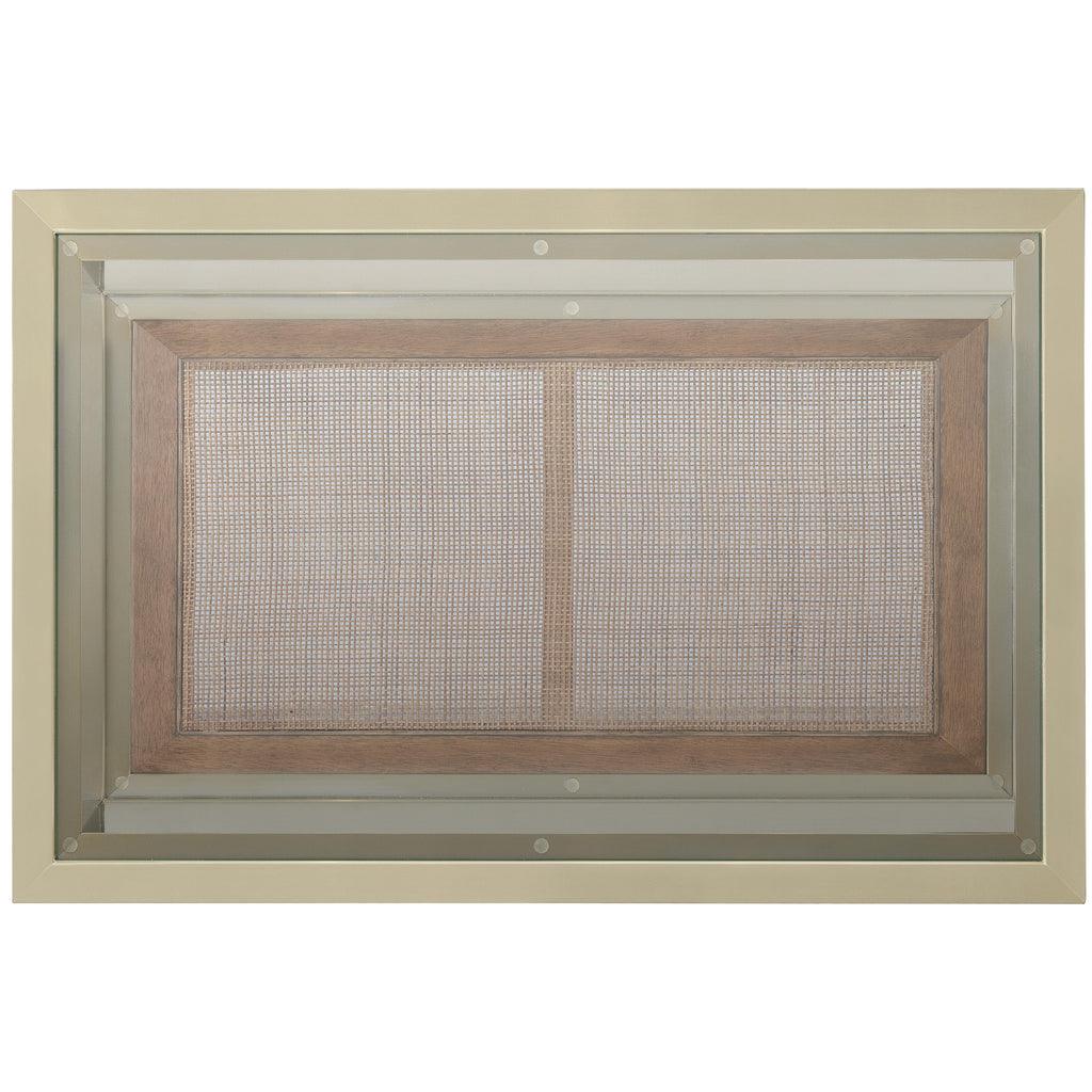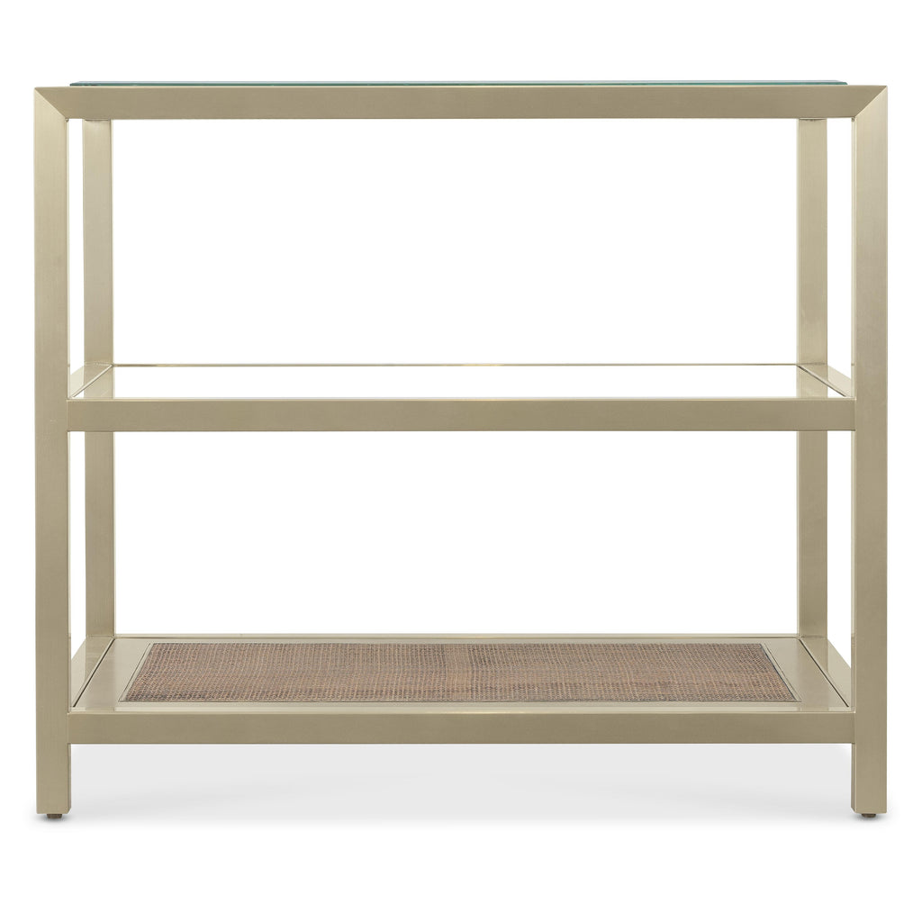 • Bottom fixed wood-framed cane shelf with glass inserts
