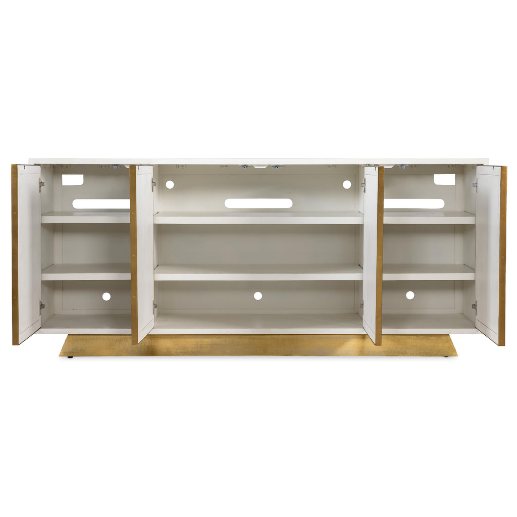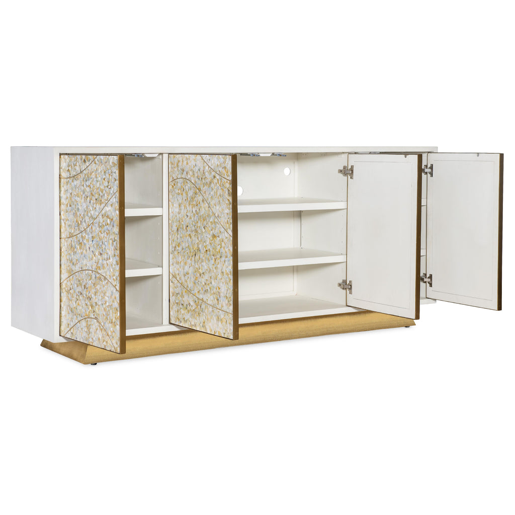 • Finish: Soft white exterior with gold plinth base. Capiz shell door fronts with gold accent trim.