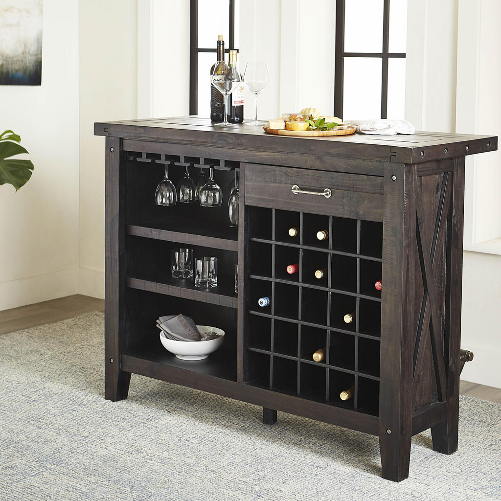 • Exposed bolts and hammered metal drawer pull
