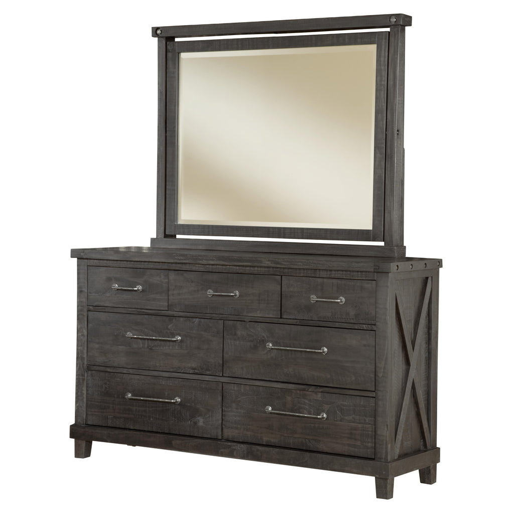 • Exposed bolts and hammered metal drawer pulls