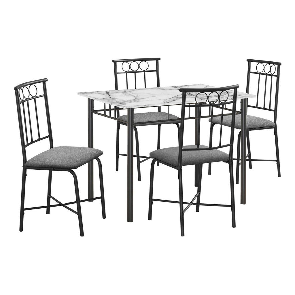 • Enjoy casual family dining with this 5pcs dining set featuring a 40" rectangular table with a fashionable white marble look laminate top with black metal legs, in contemporary design
