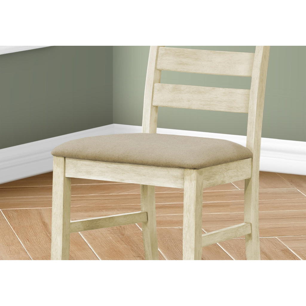• Set of 2 trendy, transitional style dining chairs standing at 38? high, with a neutral antique white finish, perfect for any dining room or kitchen space