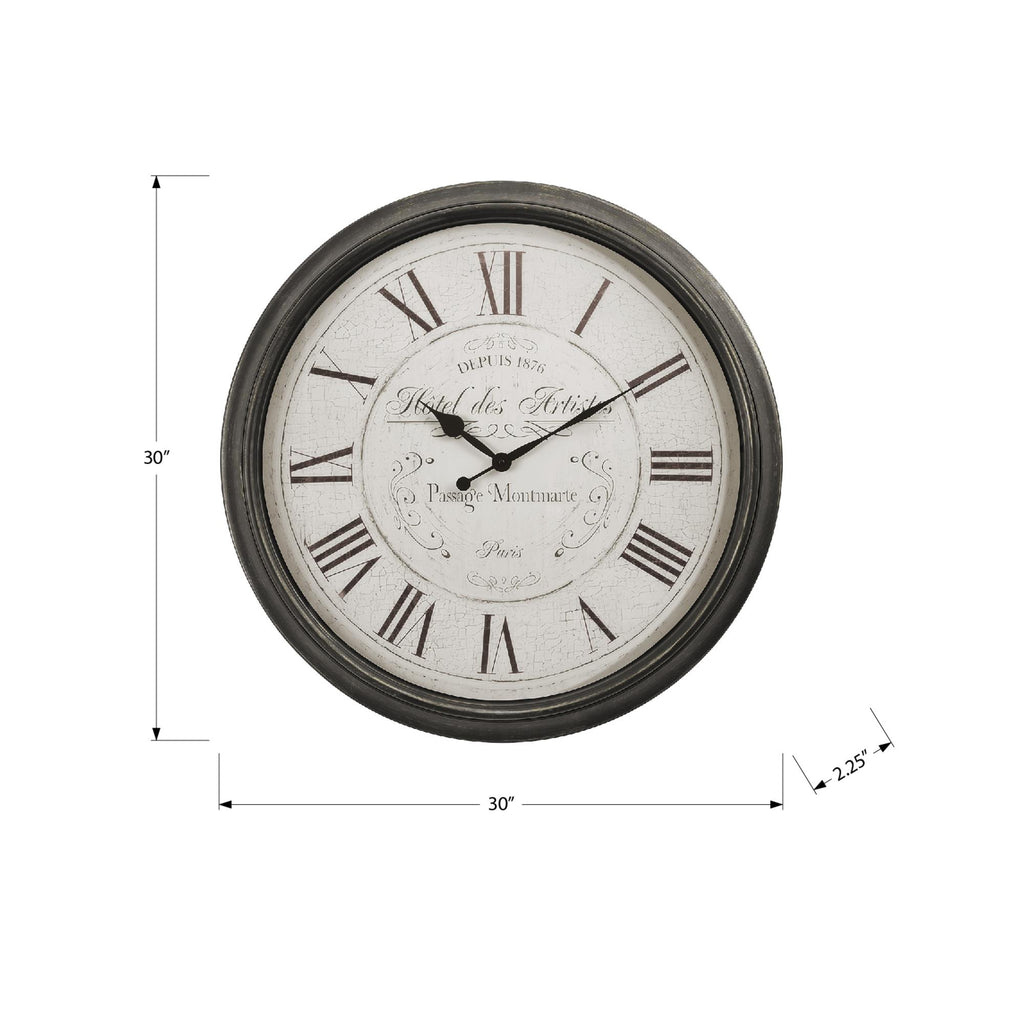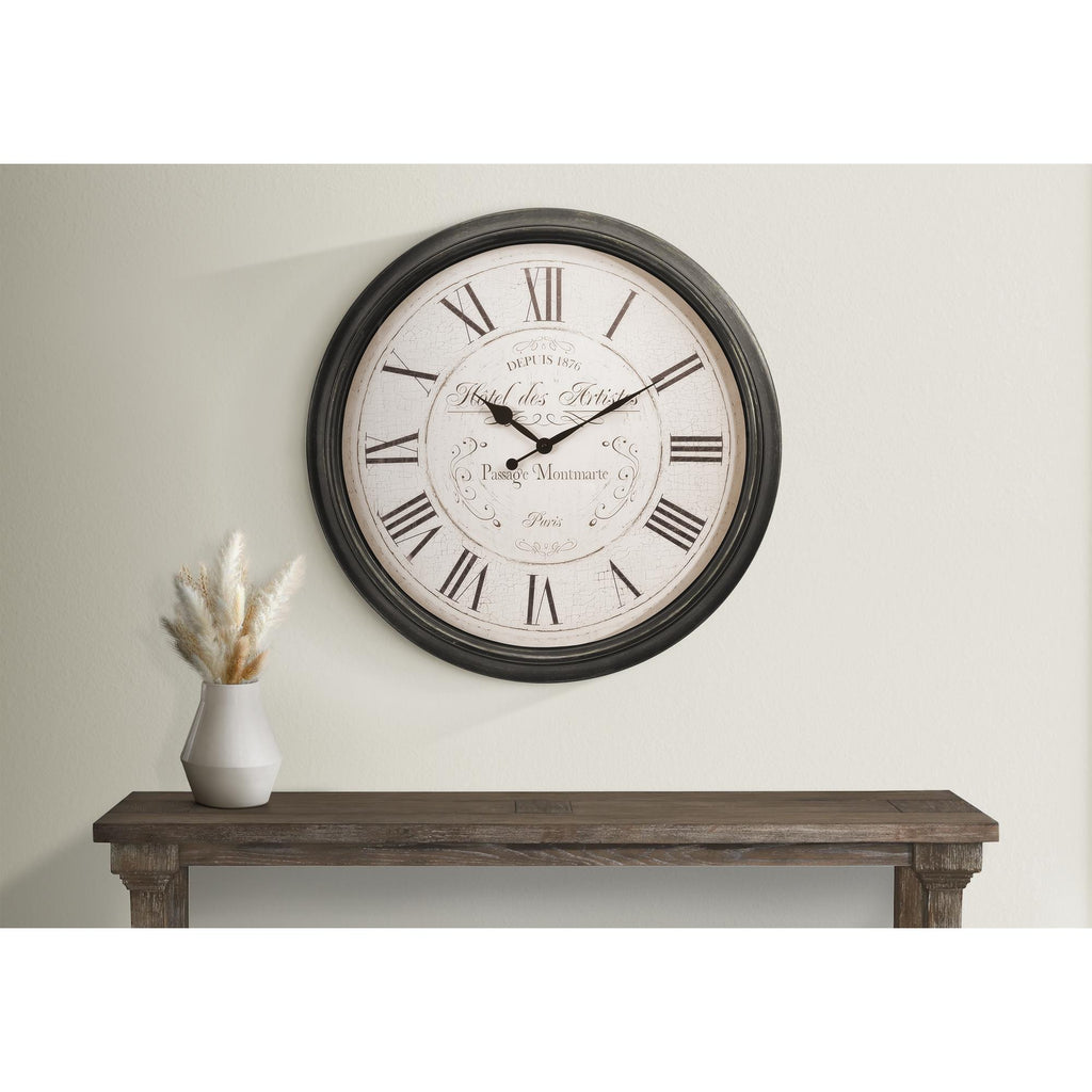 • Trendy and stylish 30" round wall clock with a durable plastic frame in an elegant brown hue and subtle distressing for a classic appeal in any home decor