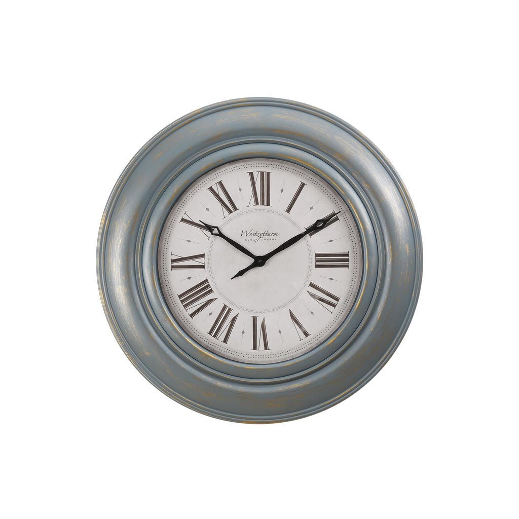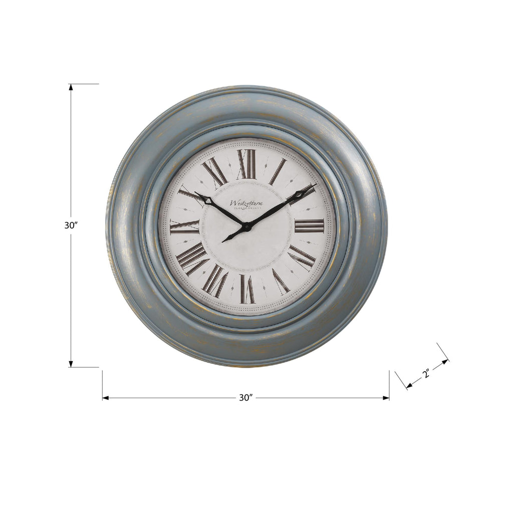 • Stylish 30" round wall clock in antique blue with subtle brushed gold accents for an elegant, transitional style, home decor accent