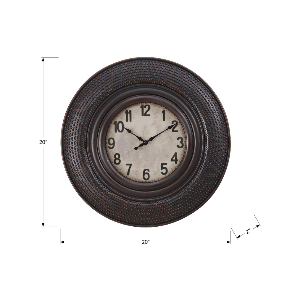 • Trendy with a vintage vibe, this 20" round wall clock in a stylish antique brown finish fits seamlessly in transitional style home decors
