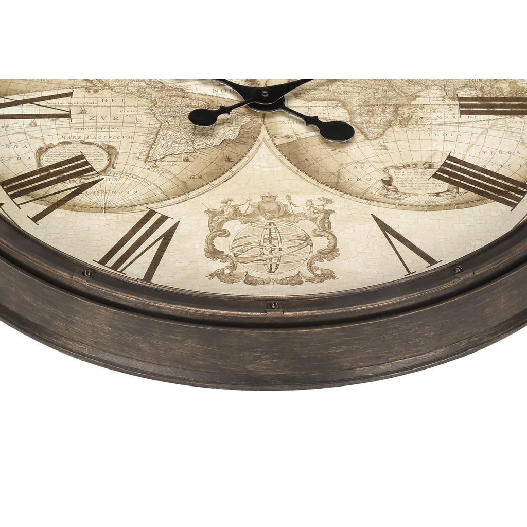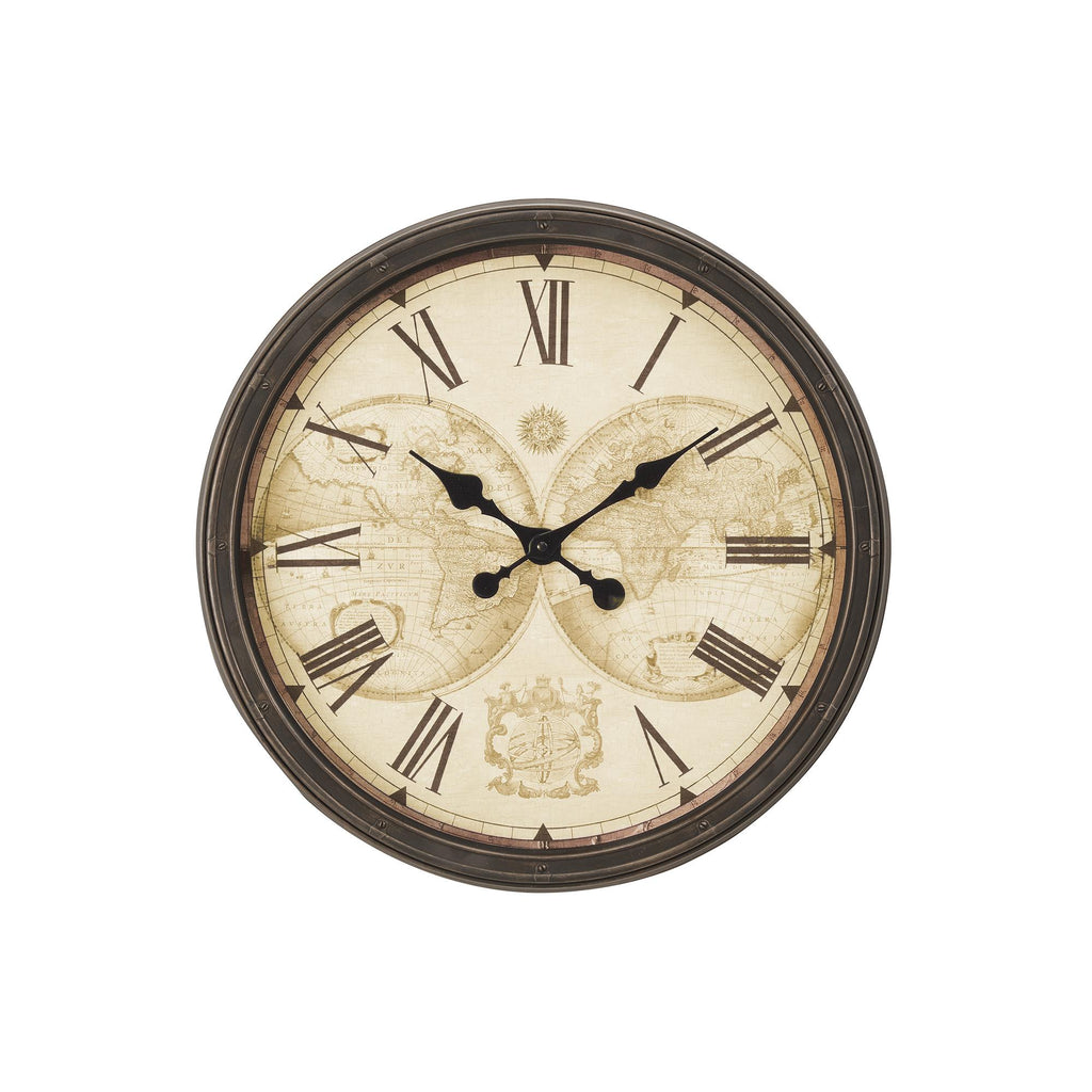 • This analog clock features easy to read roman numeric printed markings against an old-world map background for a decorative touch