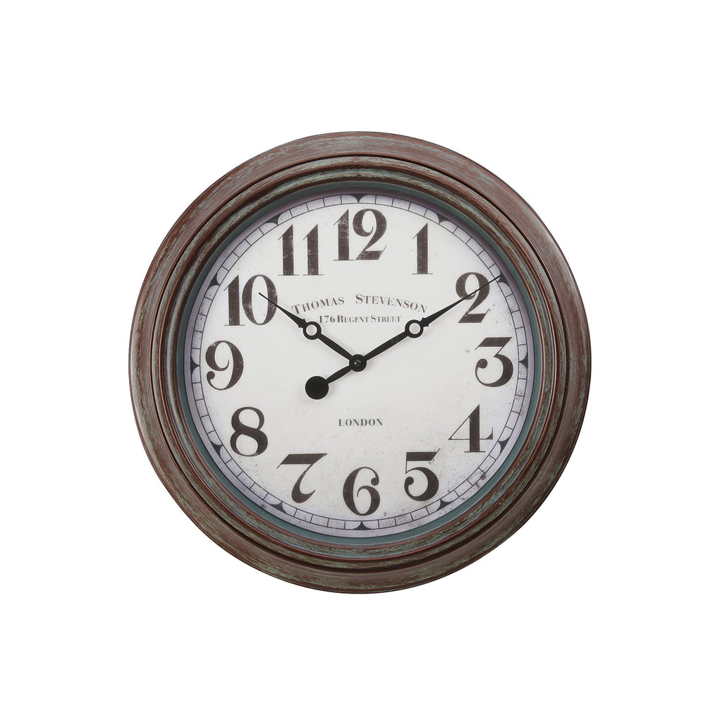• Stylish 20" round wall clock with a vintage design in a rubbed antique brown finish, perfectly blending in transitional home decors