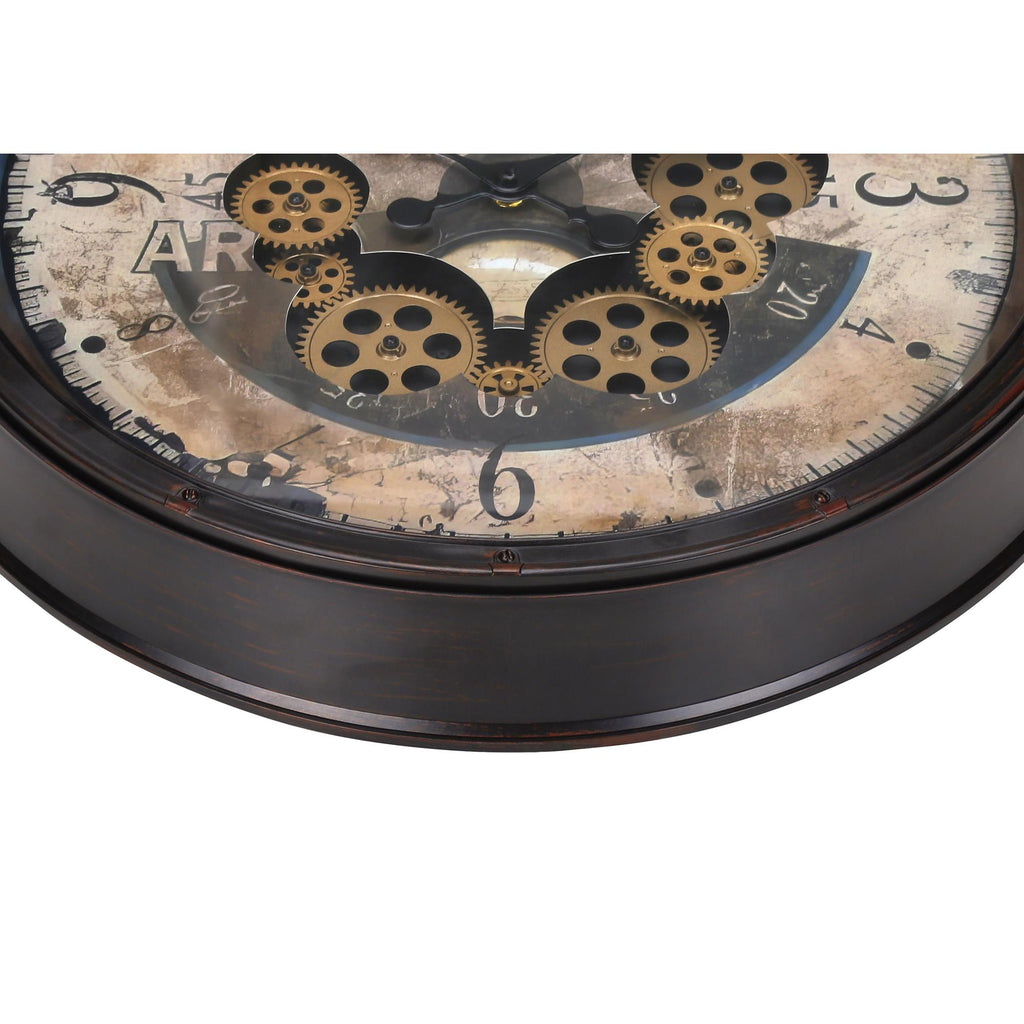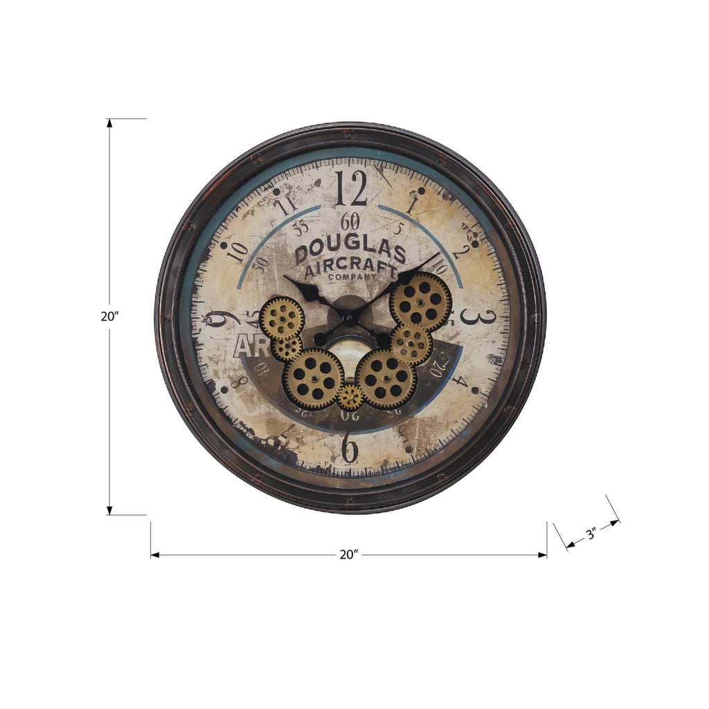 • A trendy 20" round wall clock in antique brown with a functioning gear mechanism against a vintage, aviator print backdrop, adding style to your home decor