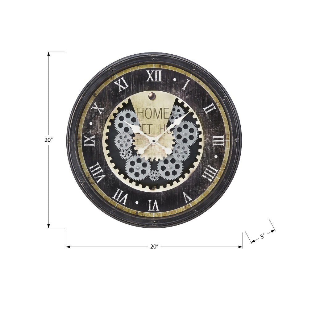 • Trendy and stylish 20" round wall clock in a sleek dark brown finish with a unique moving gear mechanism design at its center