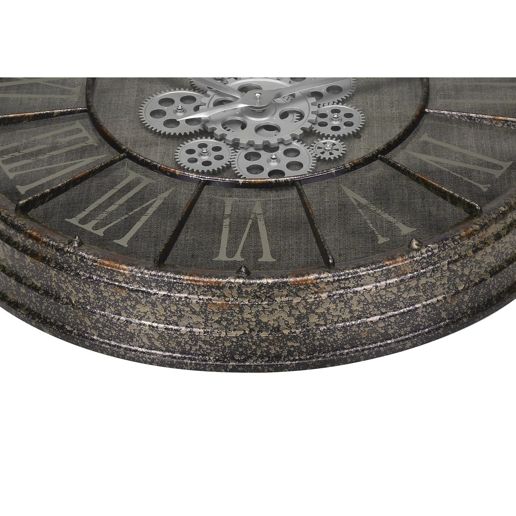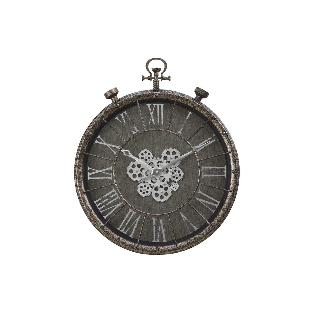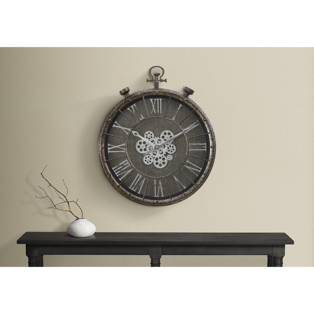 • Sophisticated, vintage, pocket-watch style 24" round wall clock with a moving gear mechanism in rustic grey finish suitable for transitional style decors