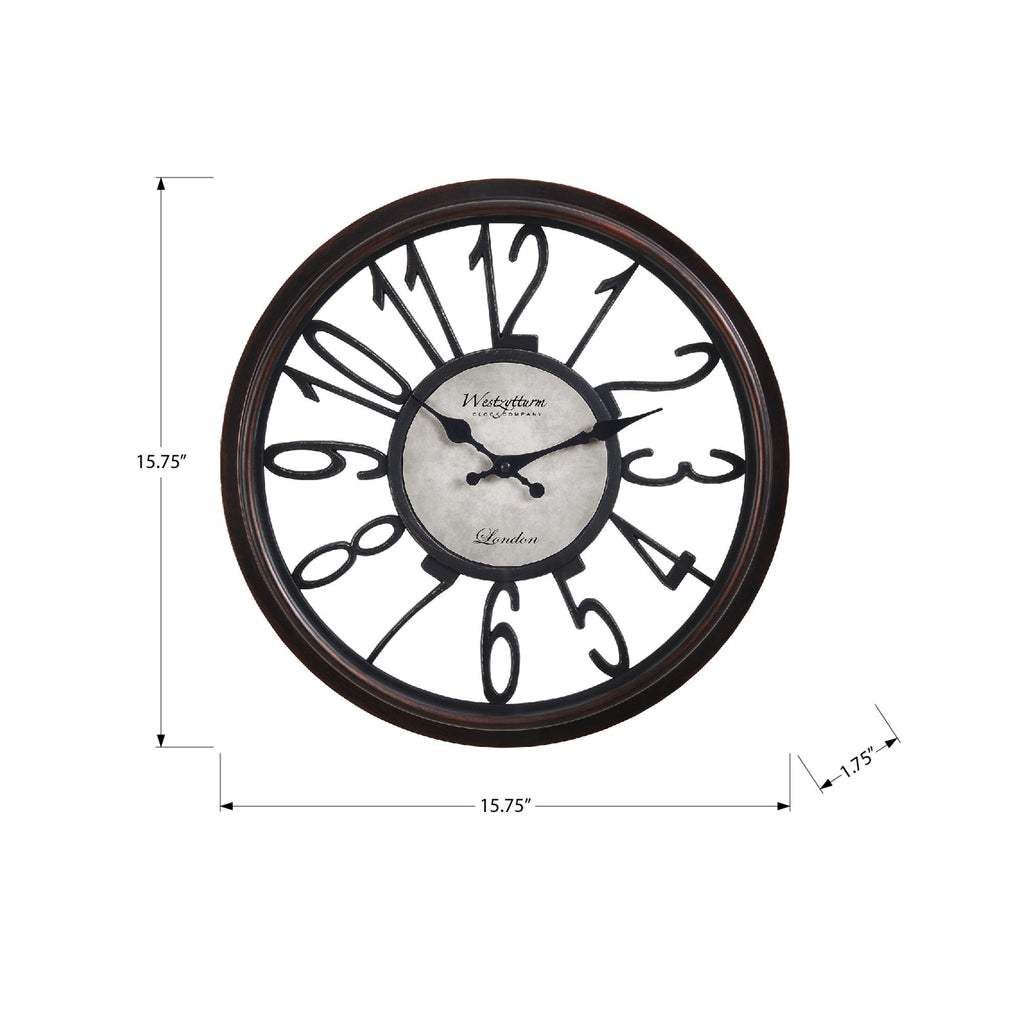 • This simple, trendy 16" round wall clock in antique brown with hints of vintage is perfect for transitional home decors