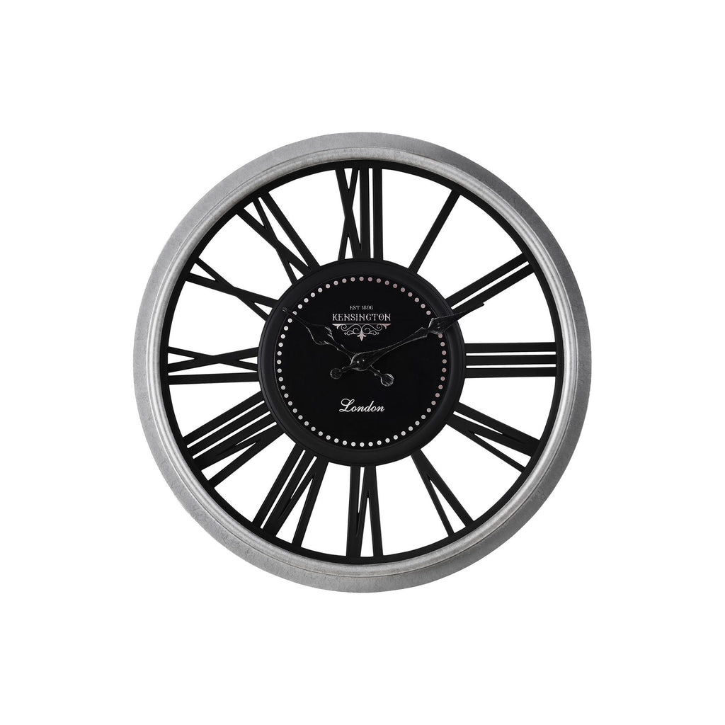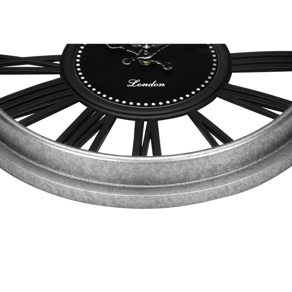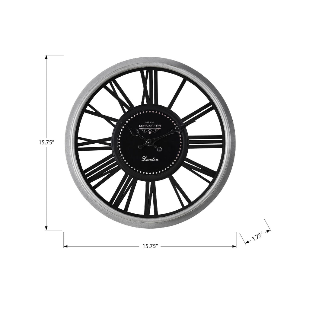 • Durable silver gray plastic frame with a glass surface, and black metal hands attached to a black vintage style backdrop for a decorative flair