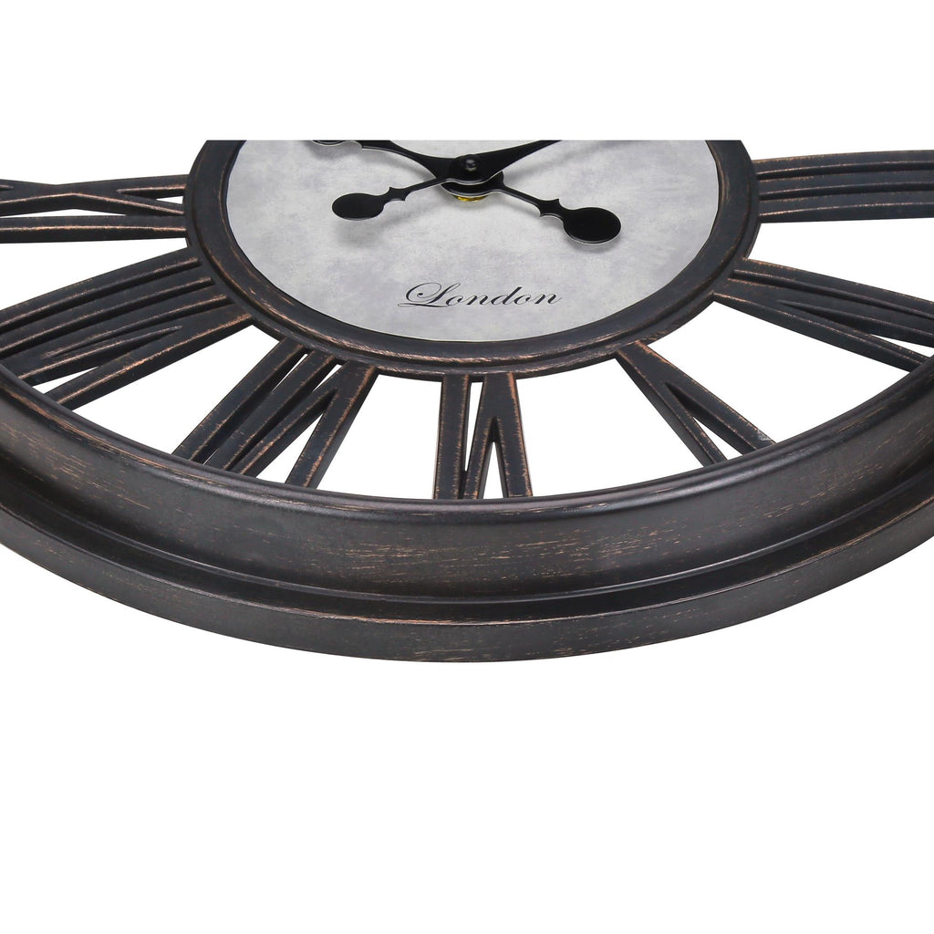 • Durable plastic frame finished in antique black with a clear glass surface, and black metal hands attached to a stamped vintage backdrop for a decorative flare