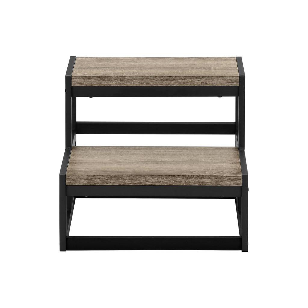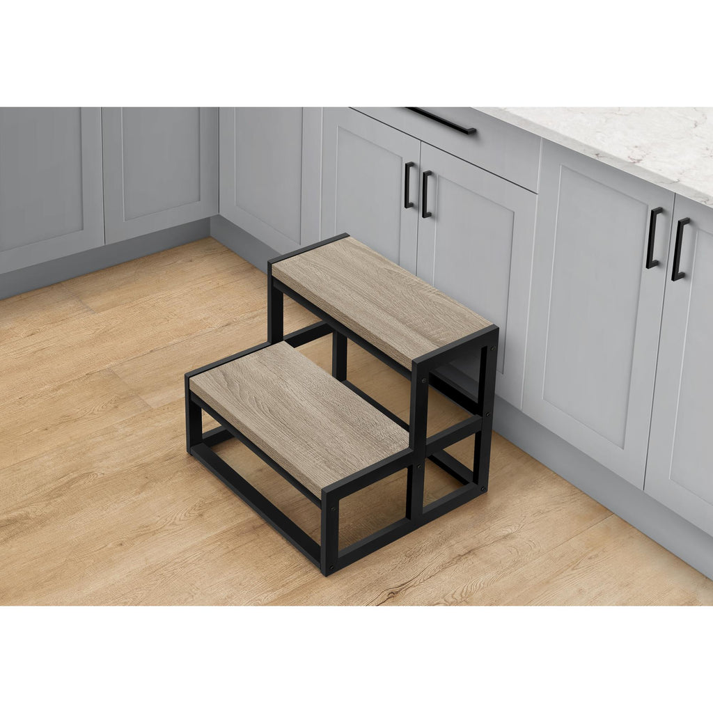 • The wide steps are finished in a warm brown wood-look laminate and framed in sturdy and strong black metal with protective floor pads to safely step up and reach for those precious stored items