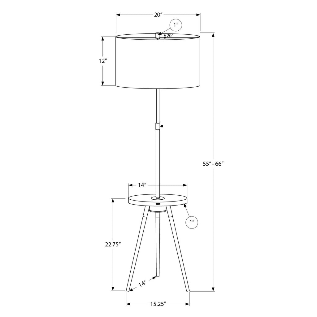 • Product dimensions: 20 in. L x 20 in. W x 66 in. H; shade: 20 in. L X 20 in. W x 12 in. H; table shelf: 14 in. L x 14 in. W x 2 in. H