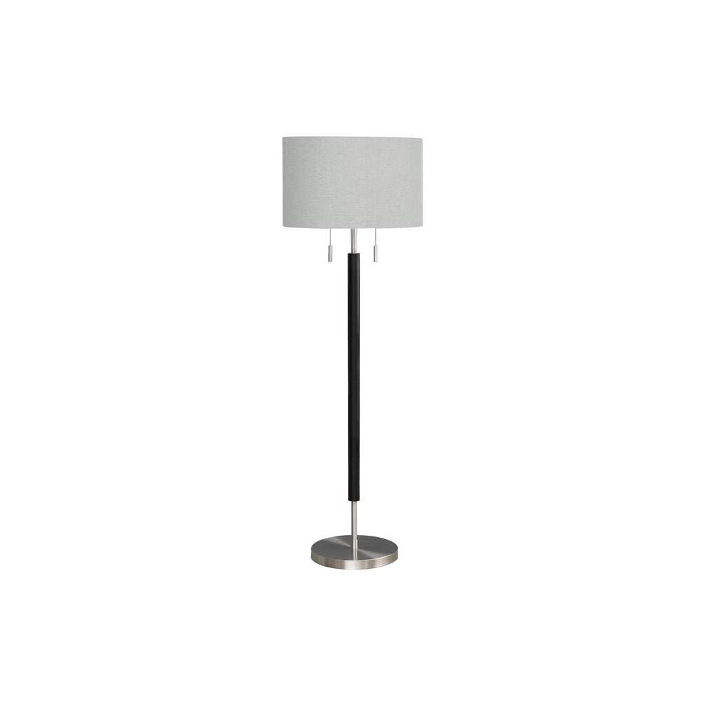 • A 60"H contemporary floor lamp with a sleek black and nickel metal finish and a stylish grey fabric shade to illuminate your living room, bedroom, or office space