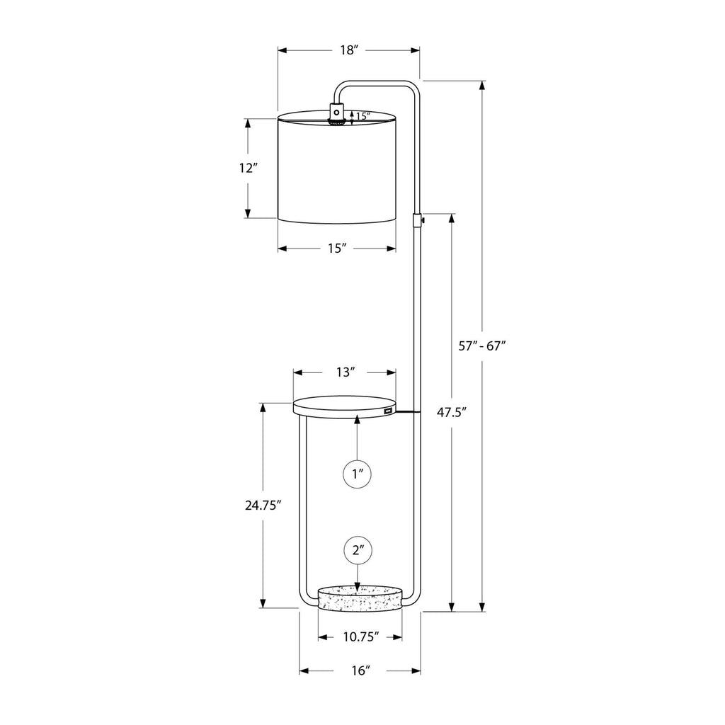 • Product dimensions: 18 in. L x 15 in. D x 57-67 in. H; base: 10.5 in. L x 10.5 in. W x 2 in. H; shade: 15 in. L x 15 in. W x 12 in. H; shelf: 13 in. L x 13 in. W x 1 in. H