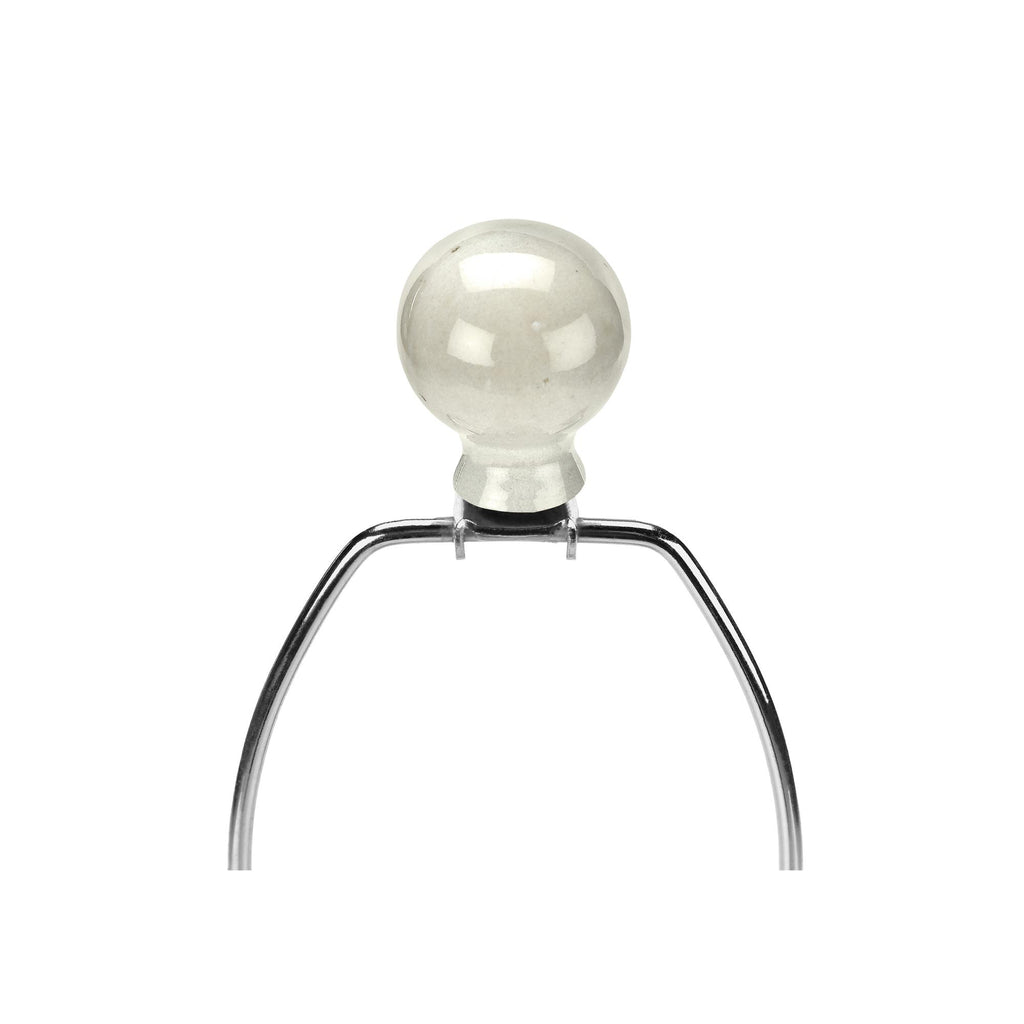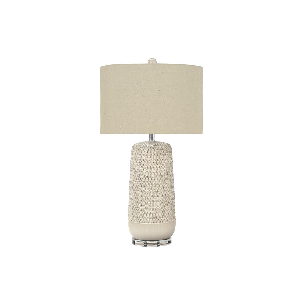 • Add some contemporary boho flair in a room with this 31"h table lamp in an attractive cream ceramic textured body with a raised pattern atop a clear acrylic base, topped with a simple beige fabric drum shade and finished with a round ceramic finial