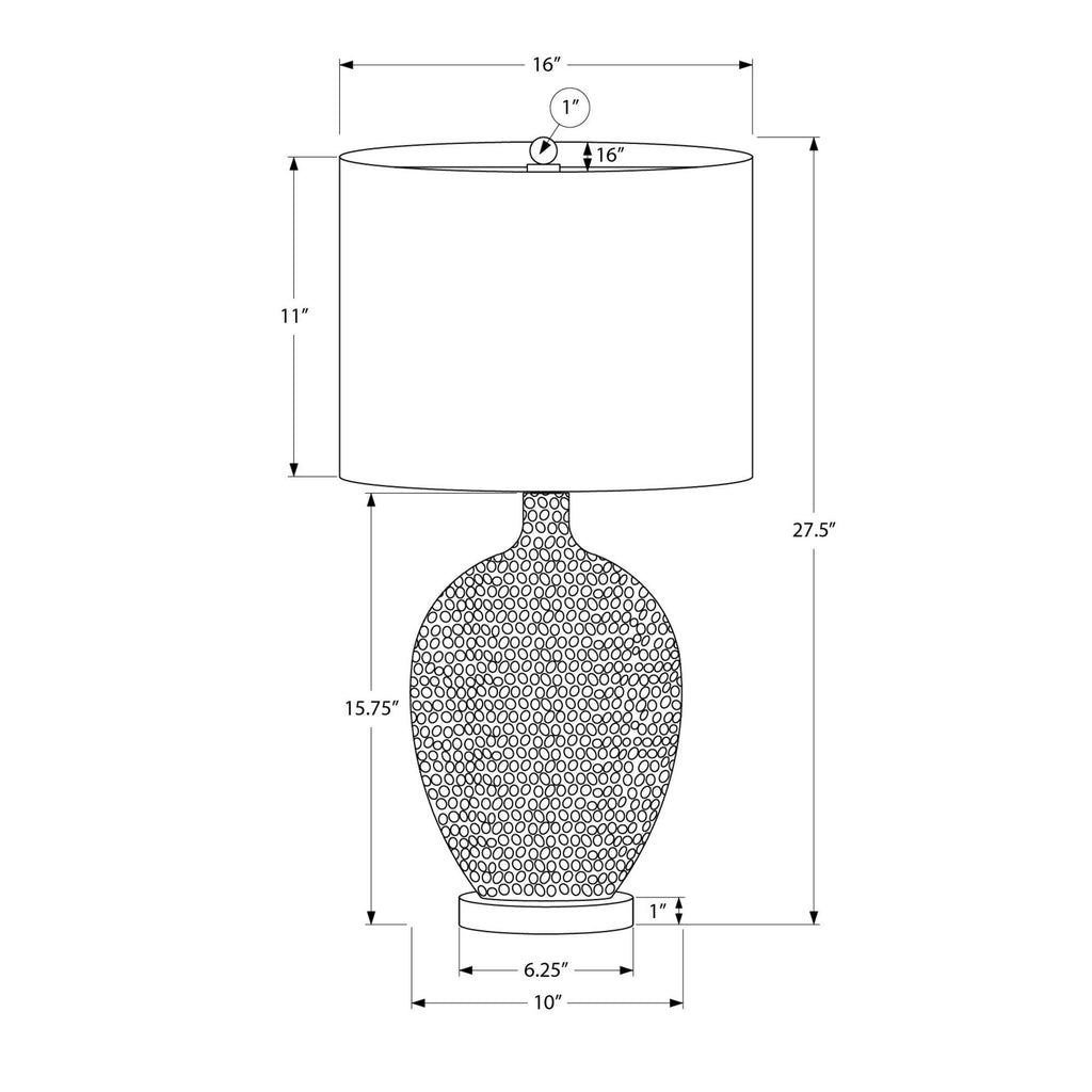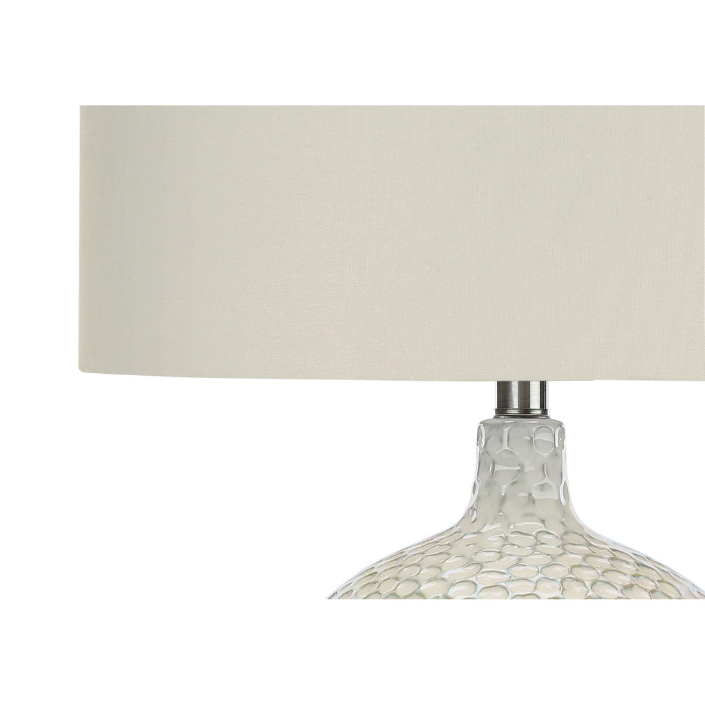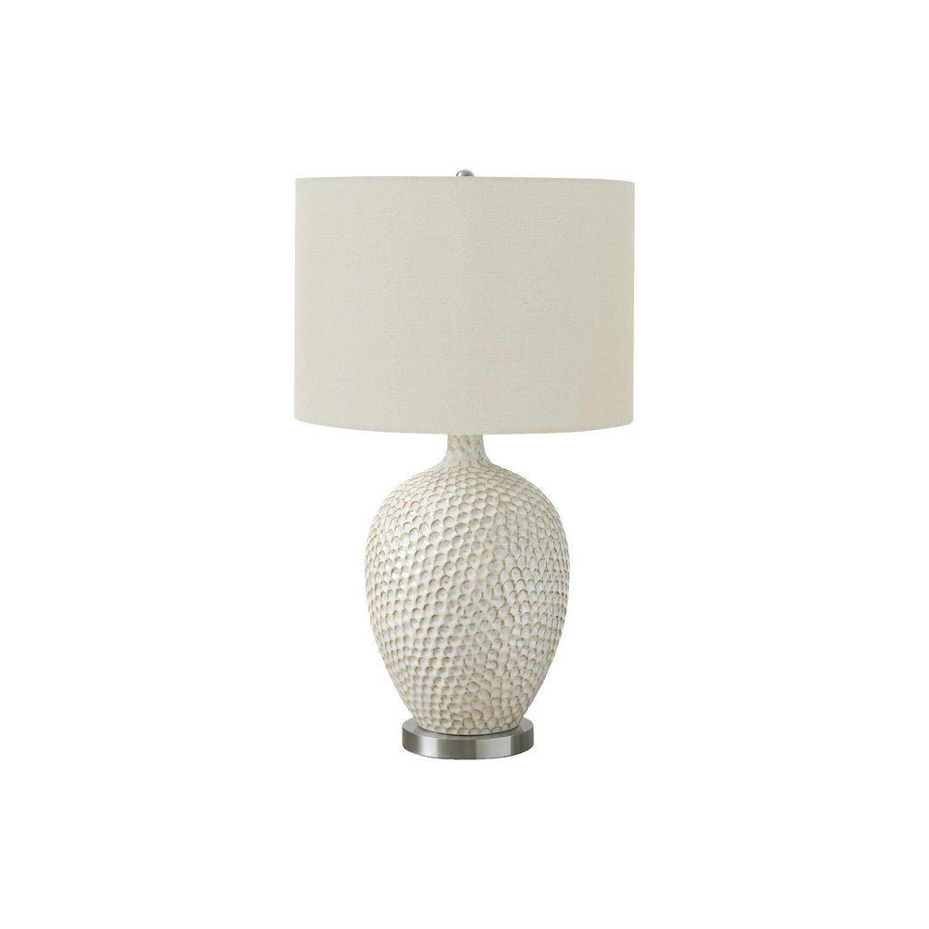 • Elevate your home with this contemporary vase shaped, 28"h cream ceramic table lamp in a textured finish, mounted on a round silver metal base and attached to a transparent 6ft long cord