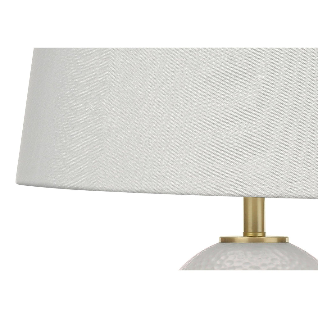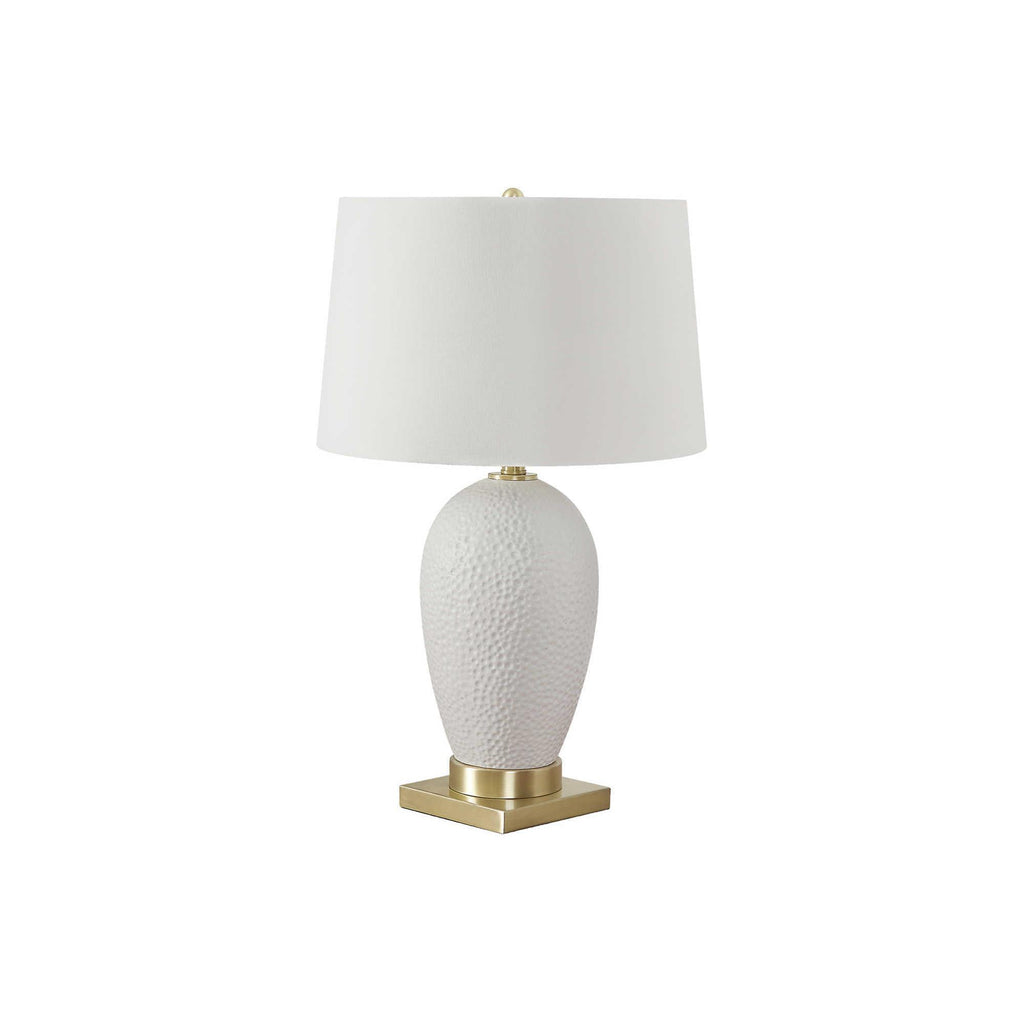 • Elevate your home with this transitional style, 26"h white ceramic table lamp with a textured finish and a stylish gold metal finial and base attached to a clear 6ft long cord