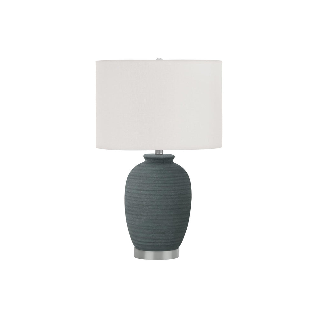 • Illuminate your space with this stylish and versatile 24"h table lamp featuring a textured finish base in a blue ceramic hue with a sleek silver metal footing, a drum shaped ivory fabric shade and finished with a round, silver finial on top