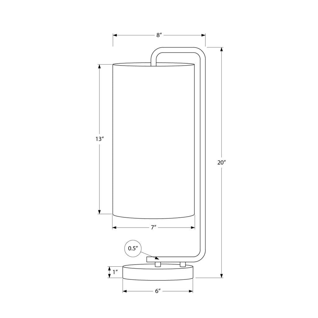 • Assembled dimensions: 8 in. L x 8 in. W x 20 in. H; base: 6 in. L x 6 in. W x 1 in. H; shade: 7 in. L x 7 in. W x 13 in. W