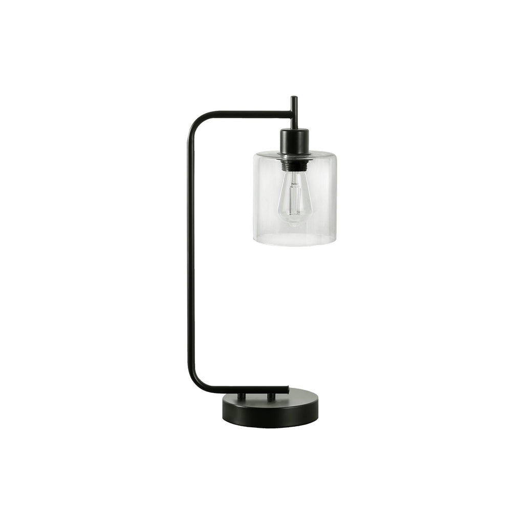• Add an industrial vibe to your space with this modern and stylish 20"h table lamp in a black metal design, with the slender arm holding a clear glass shade, perfect to place in an office, living room or bedroom setting
