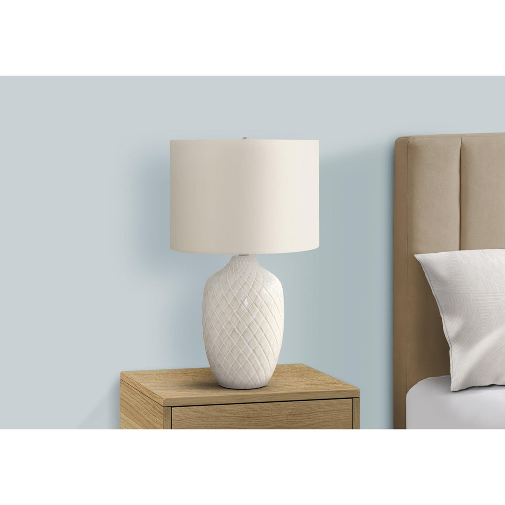 • Bring some warmth and illumination to your living room, bedroom, or home office with this stylish 25"h transitional table lamp in a elegant ginger jar shape, finished in a textured glazed cream ceramic with a simple ivory drum shade and silver finial on top