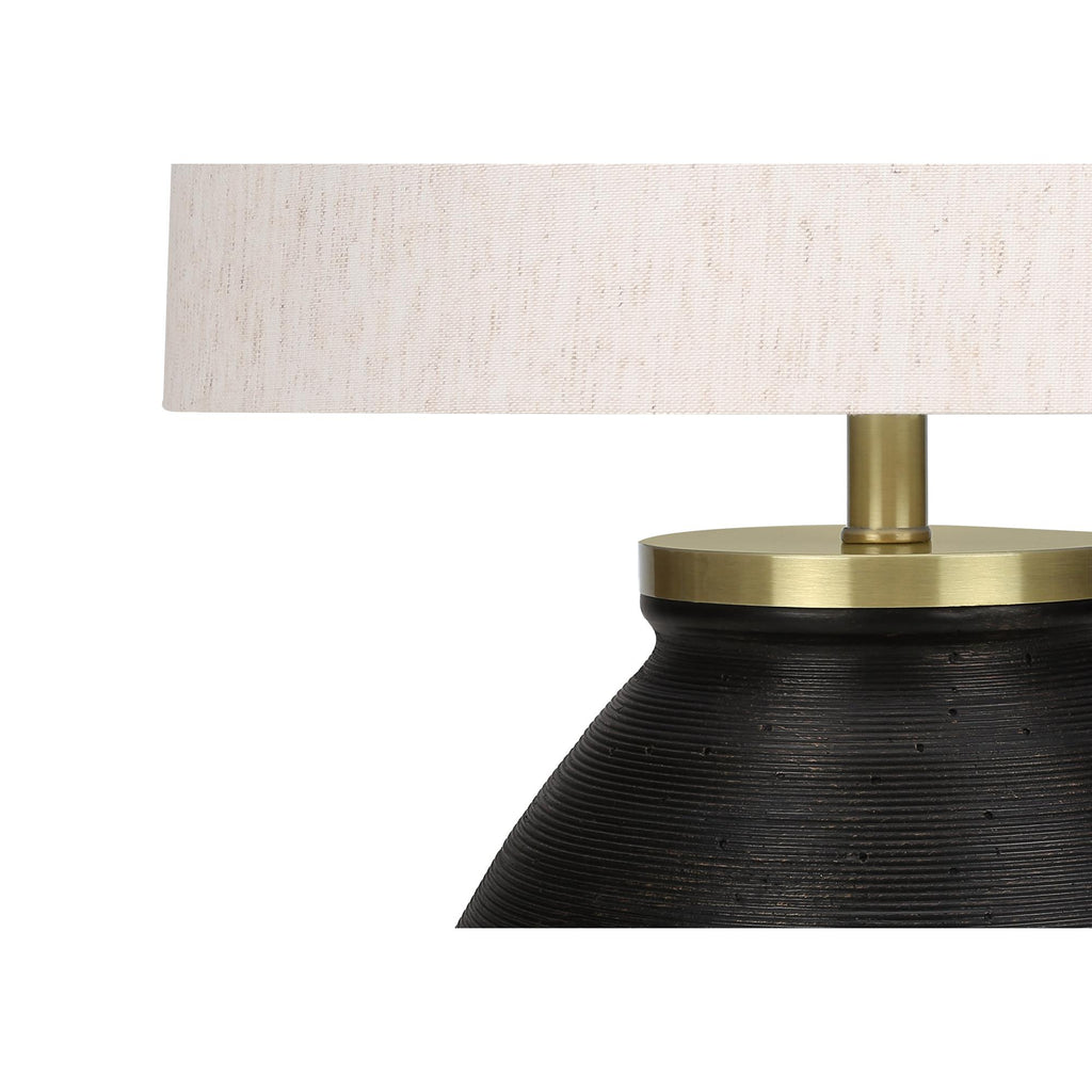 • Bring some warmth and brightness to your home with this stylish 25"h contemporary table lamp in an elegant jar shape base with a black concrete texture of fine lined ridges, topped with an ivory linen drum shade and round gold finial