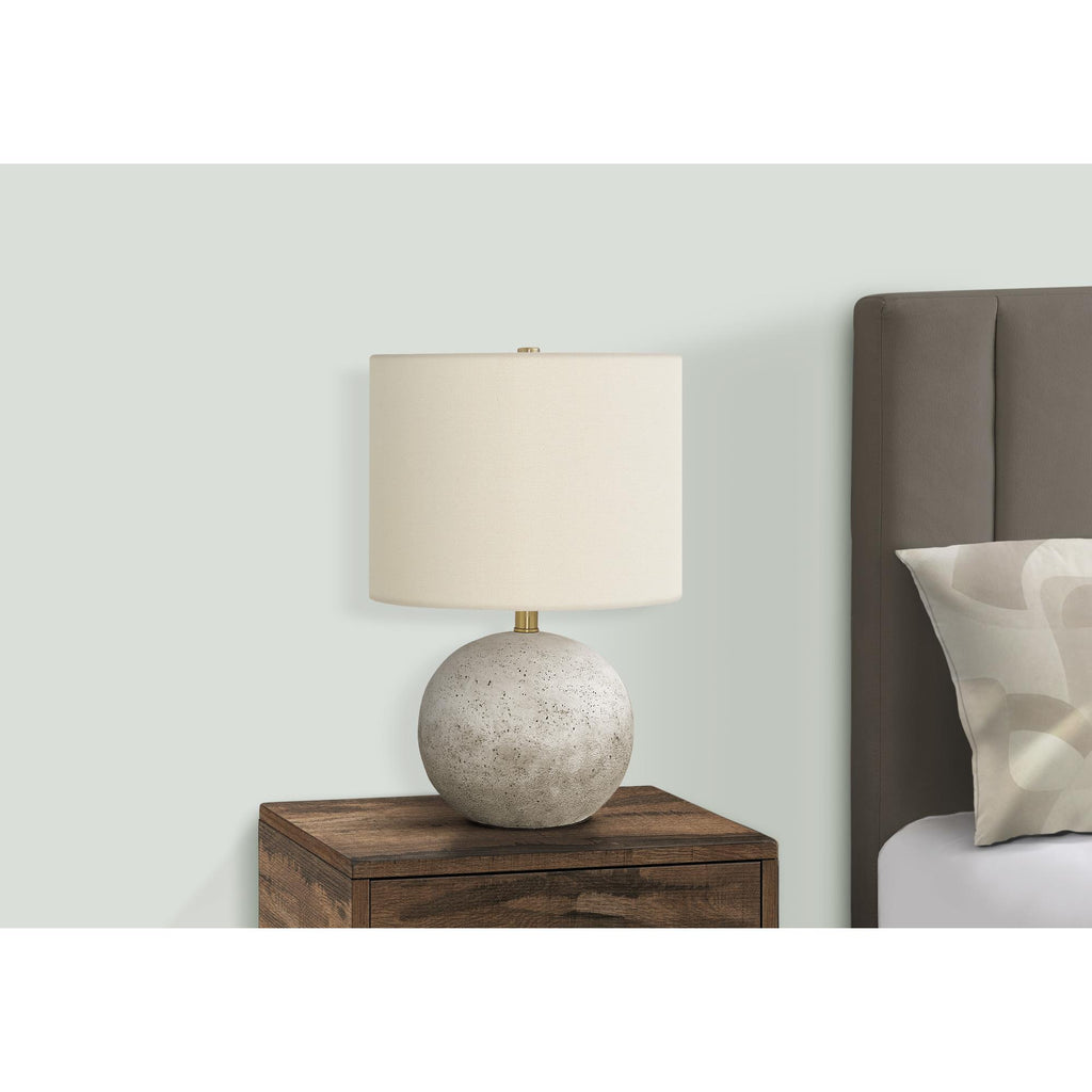 • Illuminate your office, living room, or bedroom with this chic sphere shaped 20"h table lamp with a grey concrete base in a textured finish, and topped with a refined ivory linen drum shade and gold finial for an eye-catching contemporary appeal