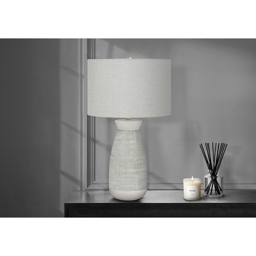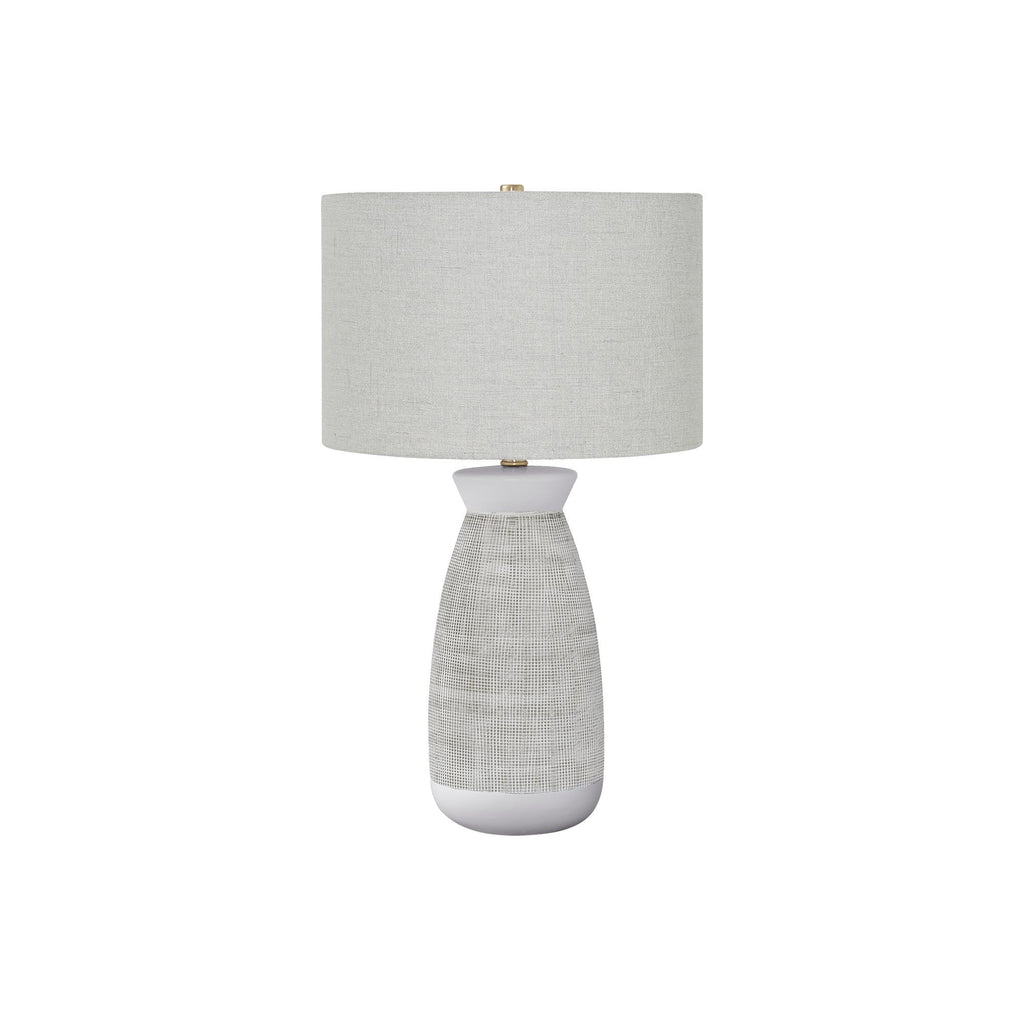 • Combining a smooth white with a textured grey finish on the vase-shaped base on this 27"h ceramic table lamp, topped with a beige linen drum shade and finished with a silver finial on top, brings a fresh, fashionable style to any contemporary living room, bedroom, or office space