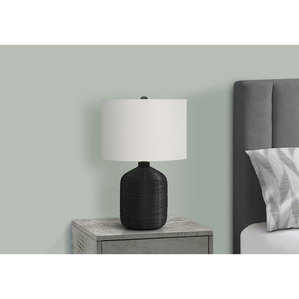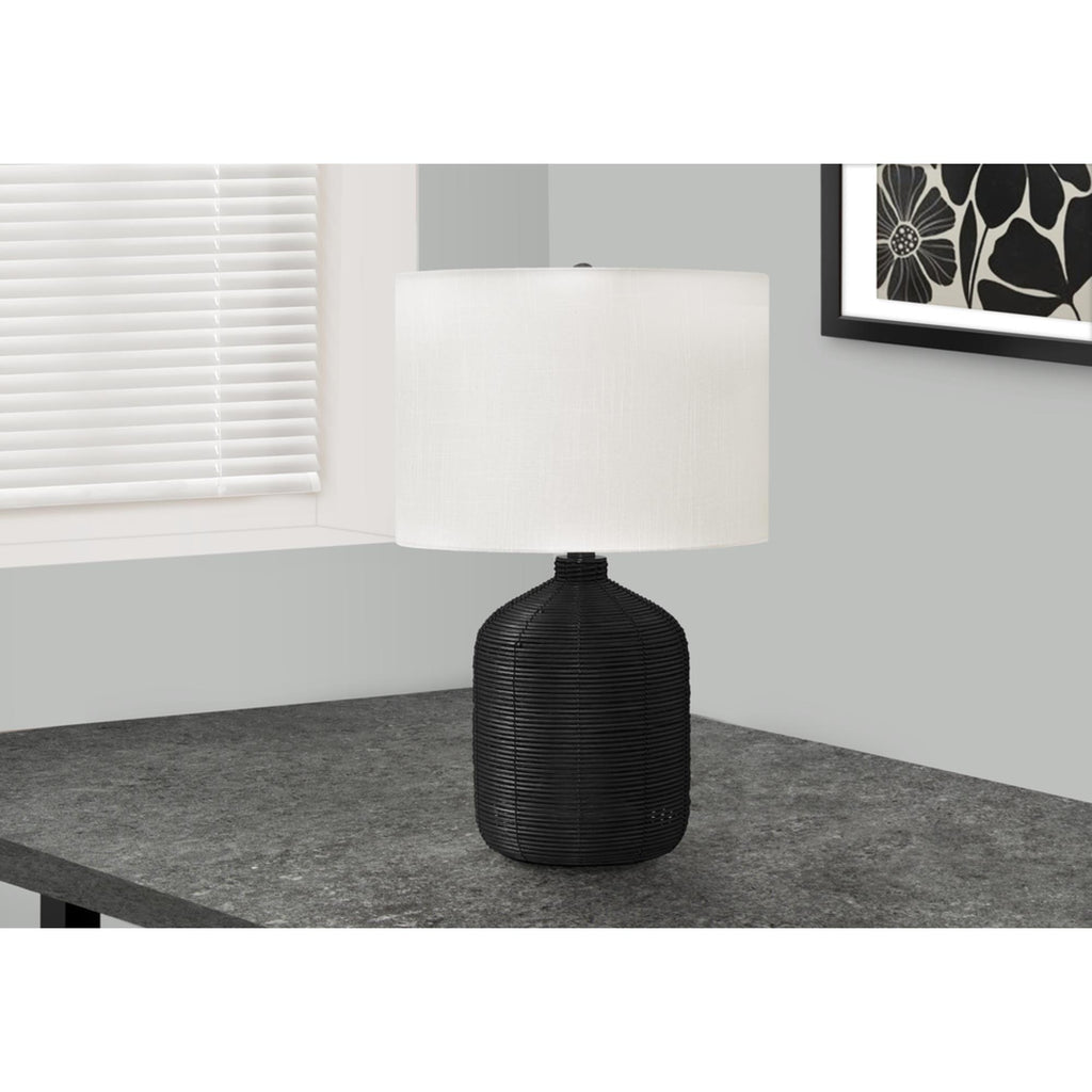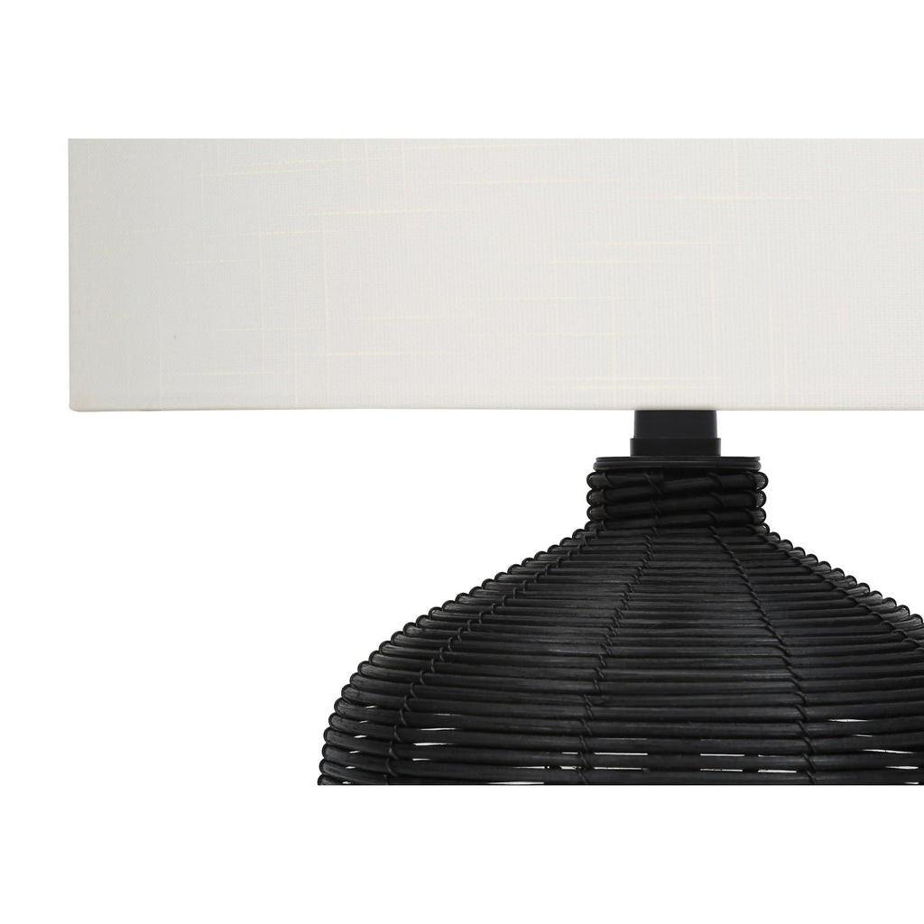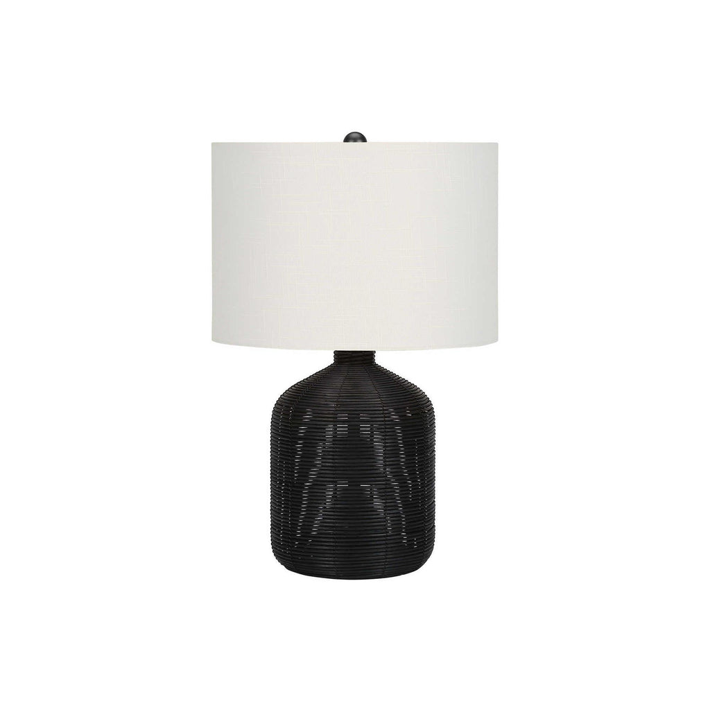 • Bring casual, contemporary flair to your home with this stylish 23"h table lamp with a ginger jar base made with black rattan textured finish base on a metal frame, and topped with a modern ivory fabric drum shade and black finial