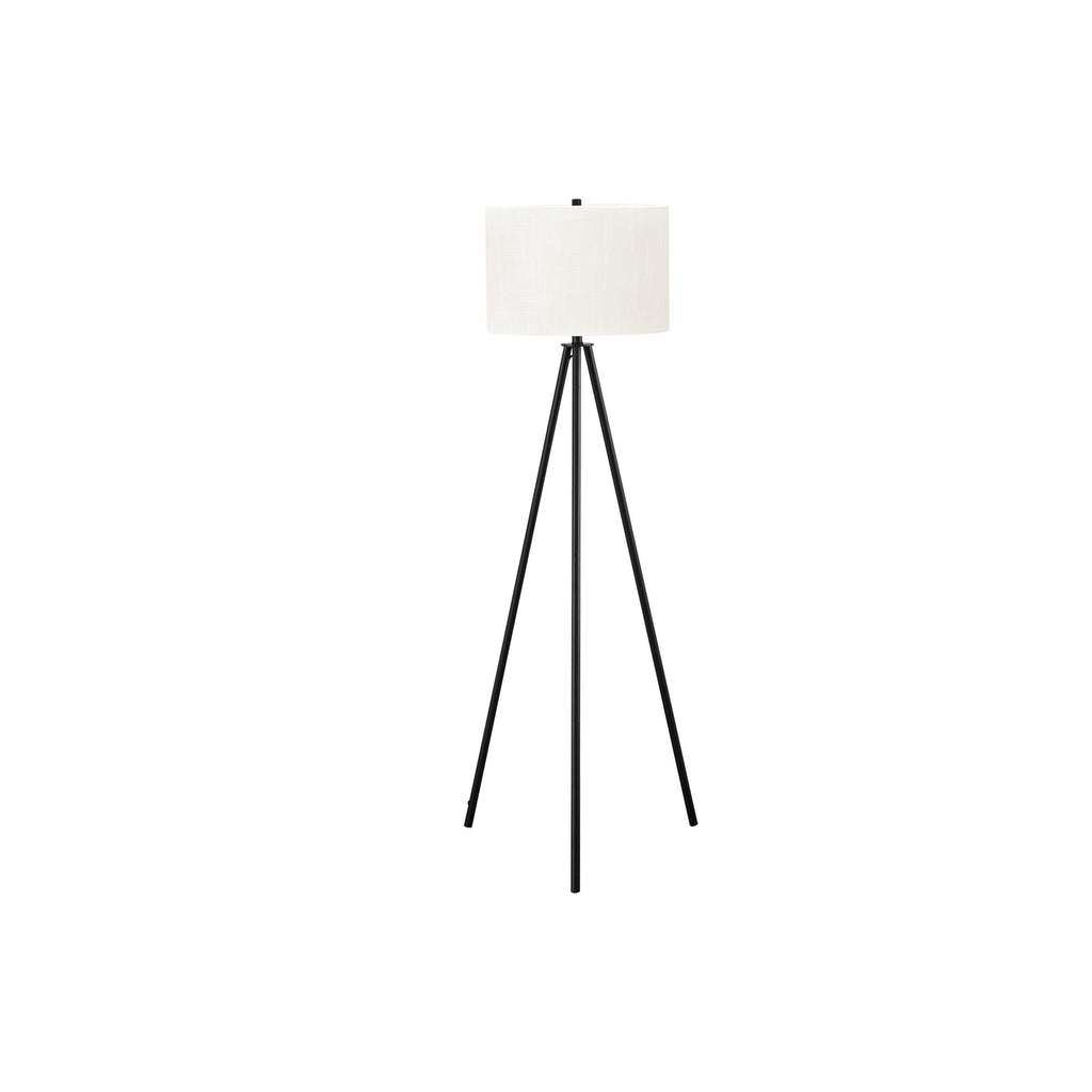 • This eye-catching 63"h floor lamp with contemporary tripod design features a striking black metal finish, contrasted with an elegant ivory linen drum shade, perfect to illuminate a corner of a room
