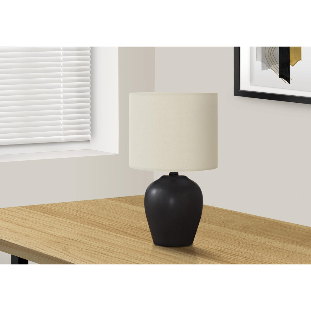 • With a transitional design, this smooth black ceramic 17"h table lamp with a round jar shaped base and topped with an ivory fabric drum shade, brings a fashionable style to any living room, bedroom, or office space